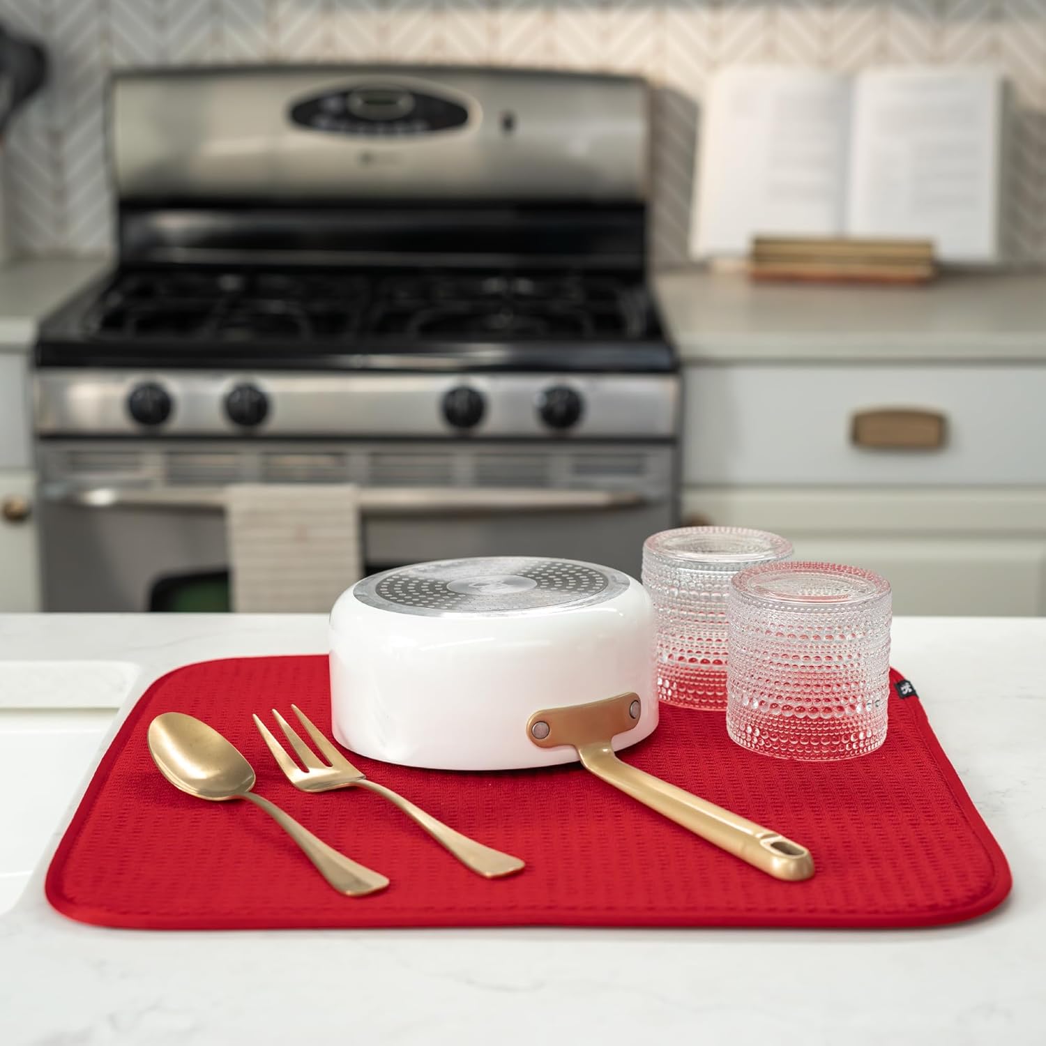 - Catch the kitchen sink drips under a dish drying rack or place your plates, forks, spoons, pots and pans set, or glassware directly on the drying mat