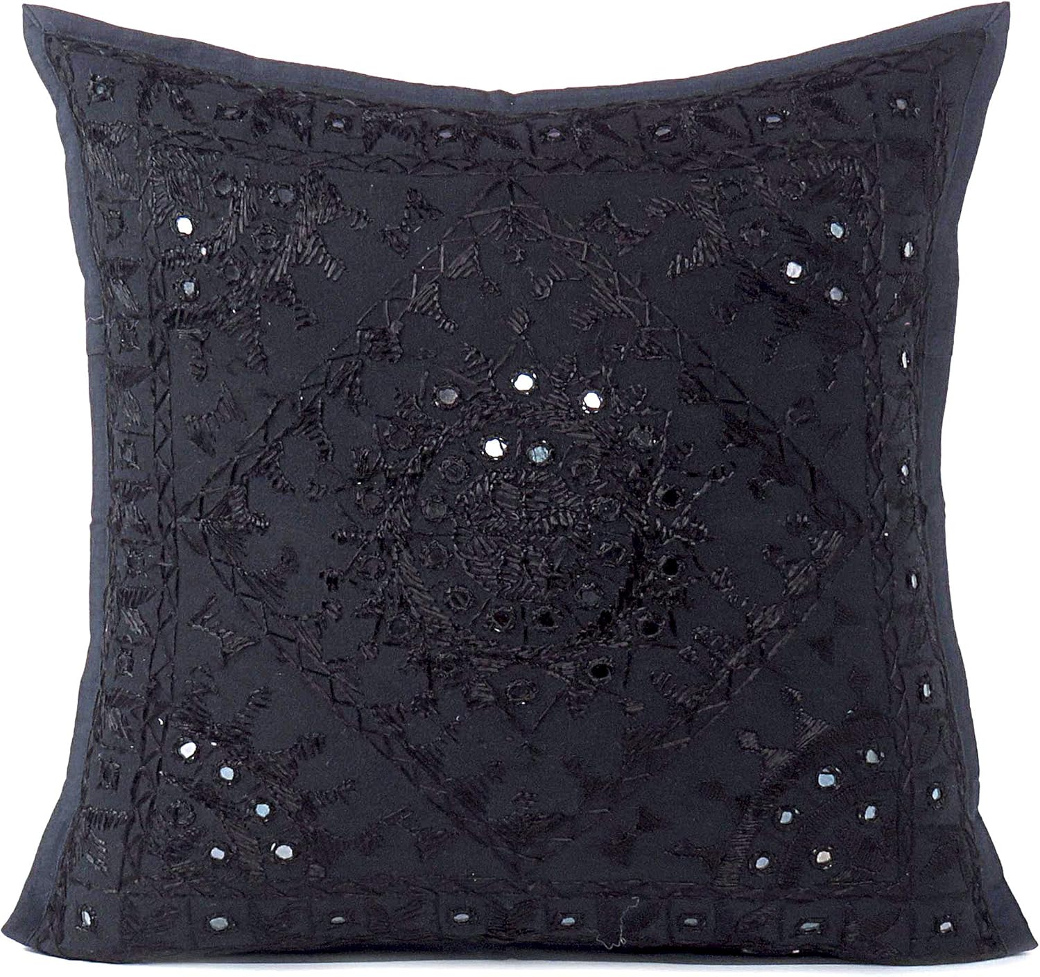 Eyes of India Embroidered Decorative Boho Throw Pillow Cover with Mirrors, Handmade Bohemian Accent Cushion Case for Sofa Couch Bedroom Living Room (Black, 24" x 24")