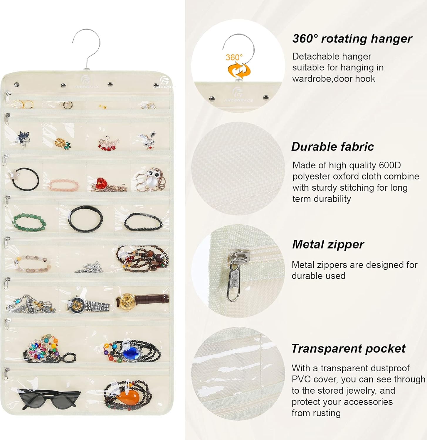 - QUALITY MATERIALS: Freegraceโs sturdy hanging jewelry organizer is made of 600D polyester Oxford fabric and has a PU backing (SIZE: 32.7โโ x 16.5โโ). The pockets are made of transparent PVC to allow you to see through to the stored jewelry, and the zipper and revolving metal hanger are well-made and durable.