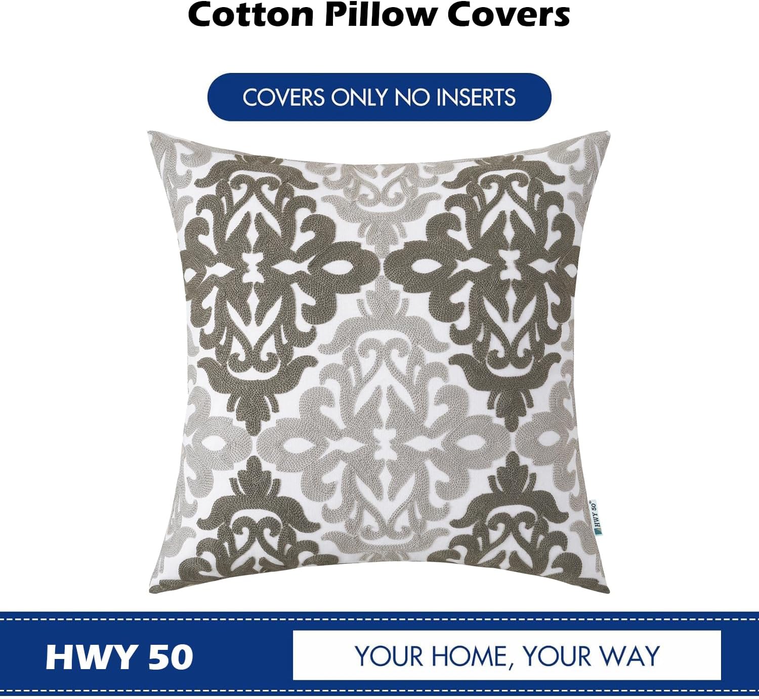 HWY 50 Grey Gray Decorative Throw Pillow Covers 18x18 Inch (1 Piece), Embroidered Cotton Farmhouse Cushion Cover Pillow Case for Sofa Couch Living Room Bed Bedroon, Floral Geometric