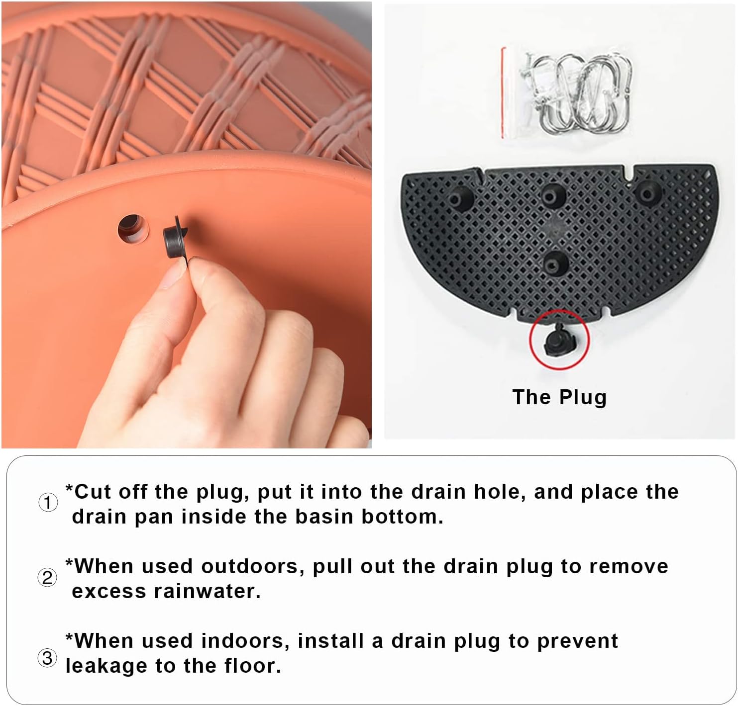 - Use instruction: Cut down the plug and put it into the drain hole,then place the drain pan at the pot bottom. Pull out drainage plug to allow for the removal of excess rainwater when installed outdoors. Install drainage plug when used indoors.