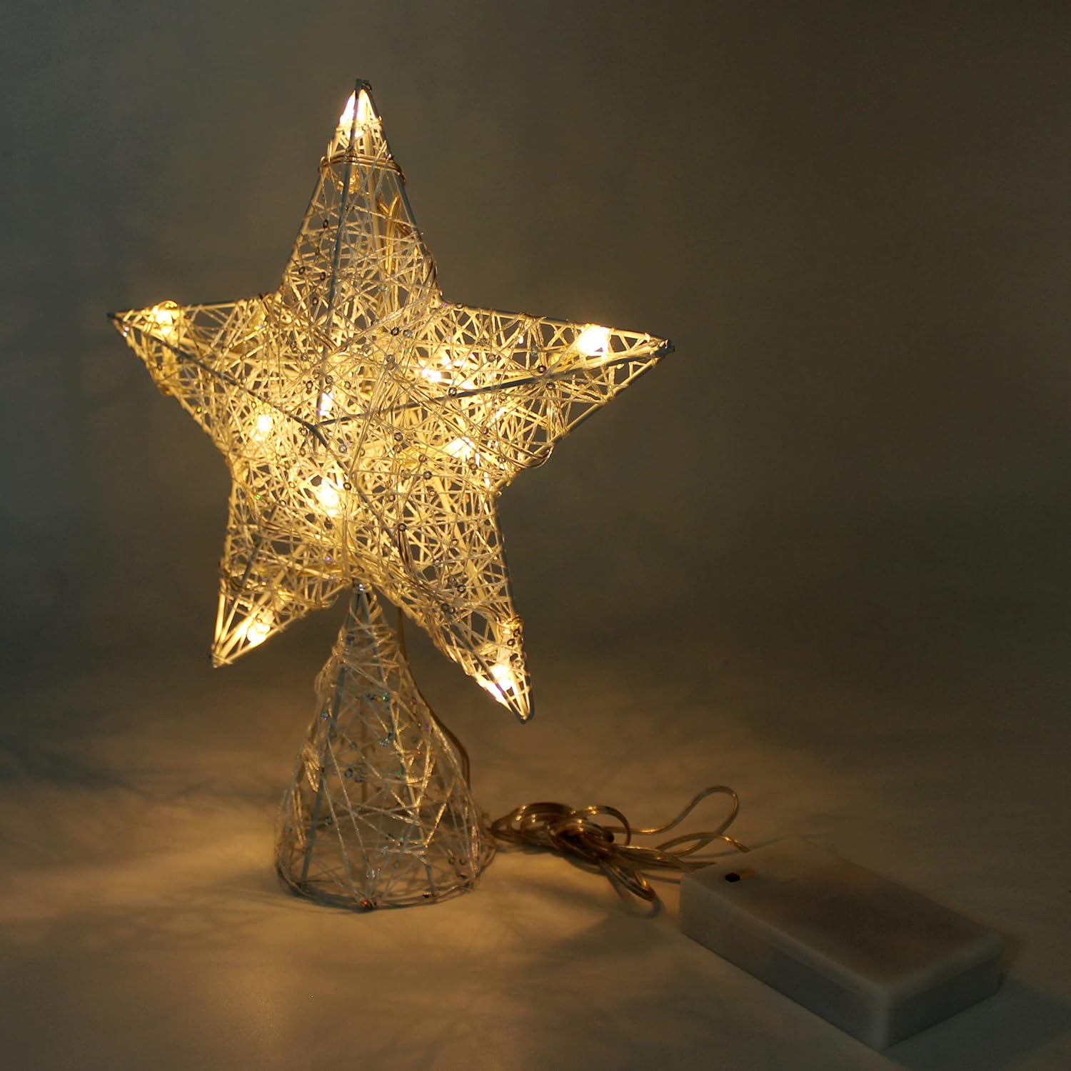 CVHOMEDECO. White Tree Top Star with Warm White LED Lights and Timer for Christmas Ornaments and Holiday Seasonal Décor, 8 x 10 Inch