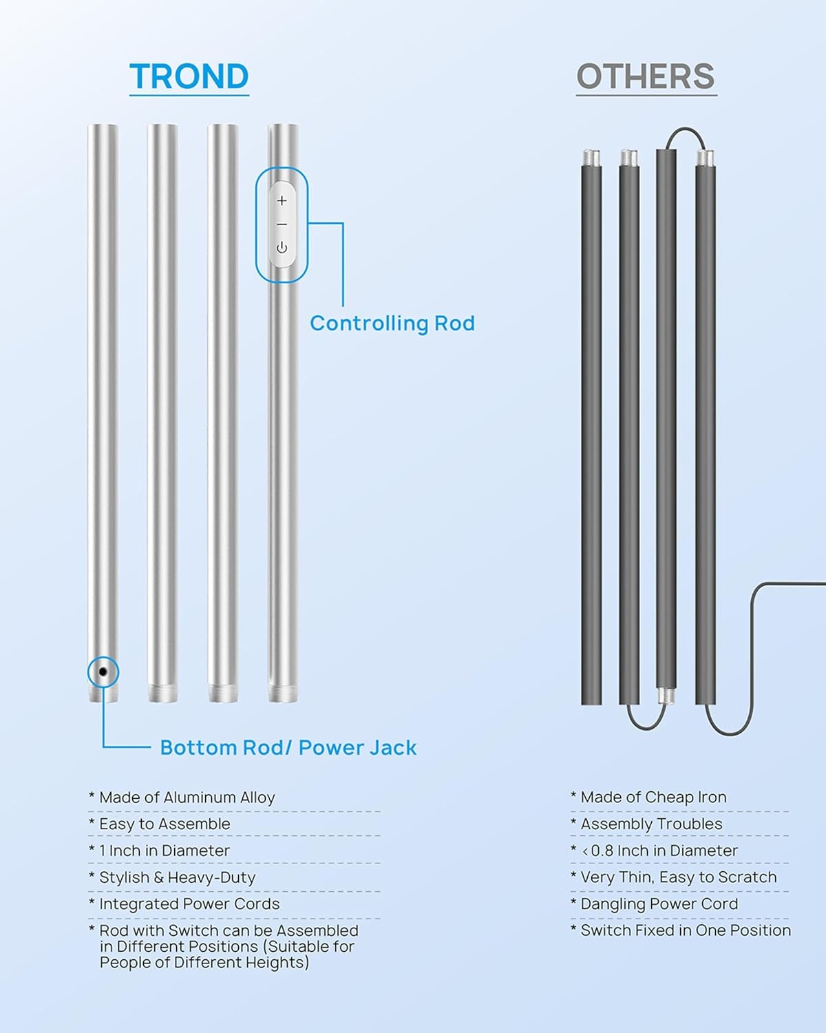 - Modern Floor Lamp: This floor lamp innovatively features 4 detachable modular aluminum rods, all of which have the integrated power cords built inside. This design gives you the convenience and flexibility to assemble, disassemble and adjust the height. The tall floor lamp total height is 180 cm/71 in, taller than other similar lamps, so that you won’t stare directly at the bright light
