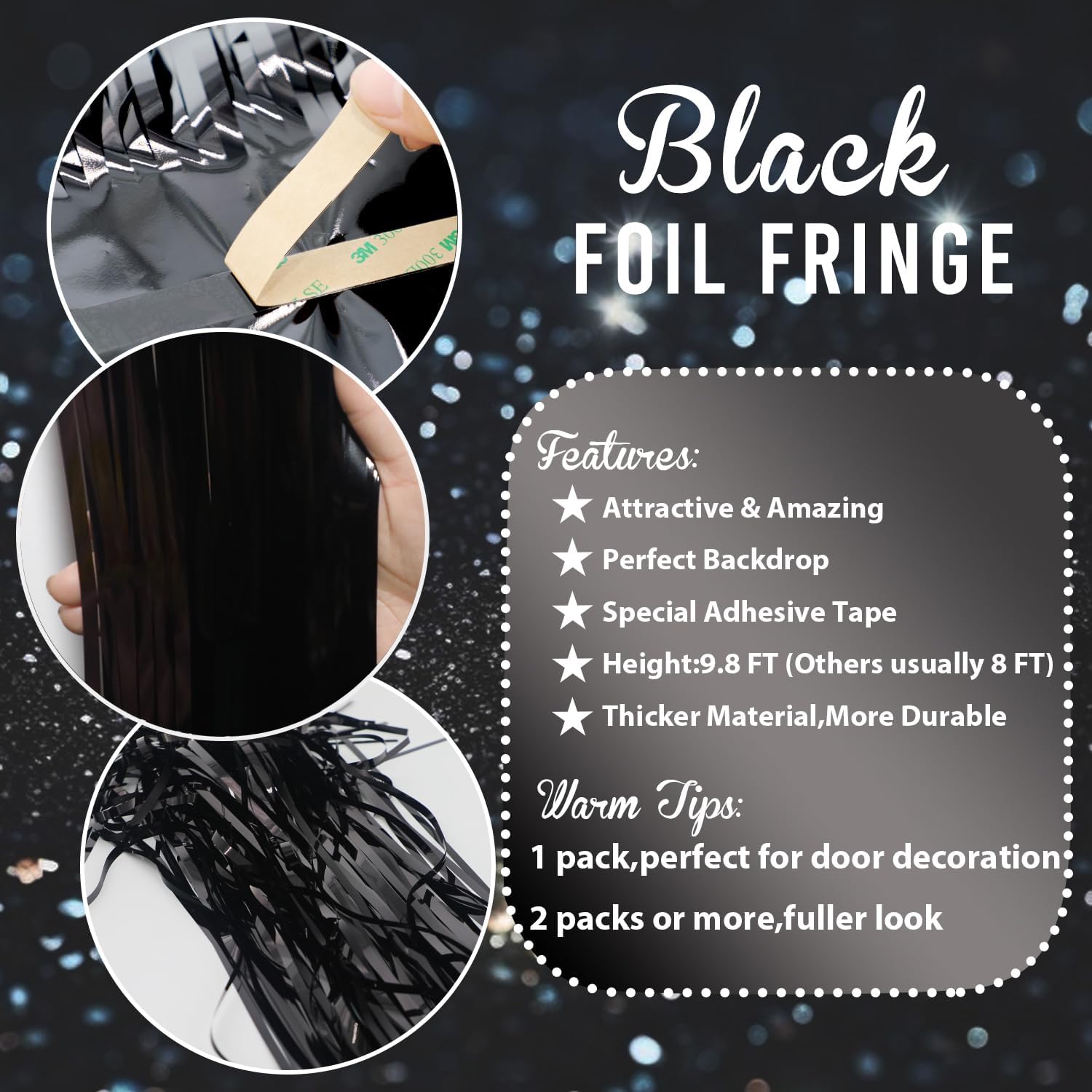 - Package Includes:2 pack black foil fringe curtains,3.2 ft x9.8 ft each,suitable for hanging on a door or coverage a wall fully