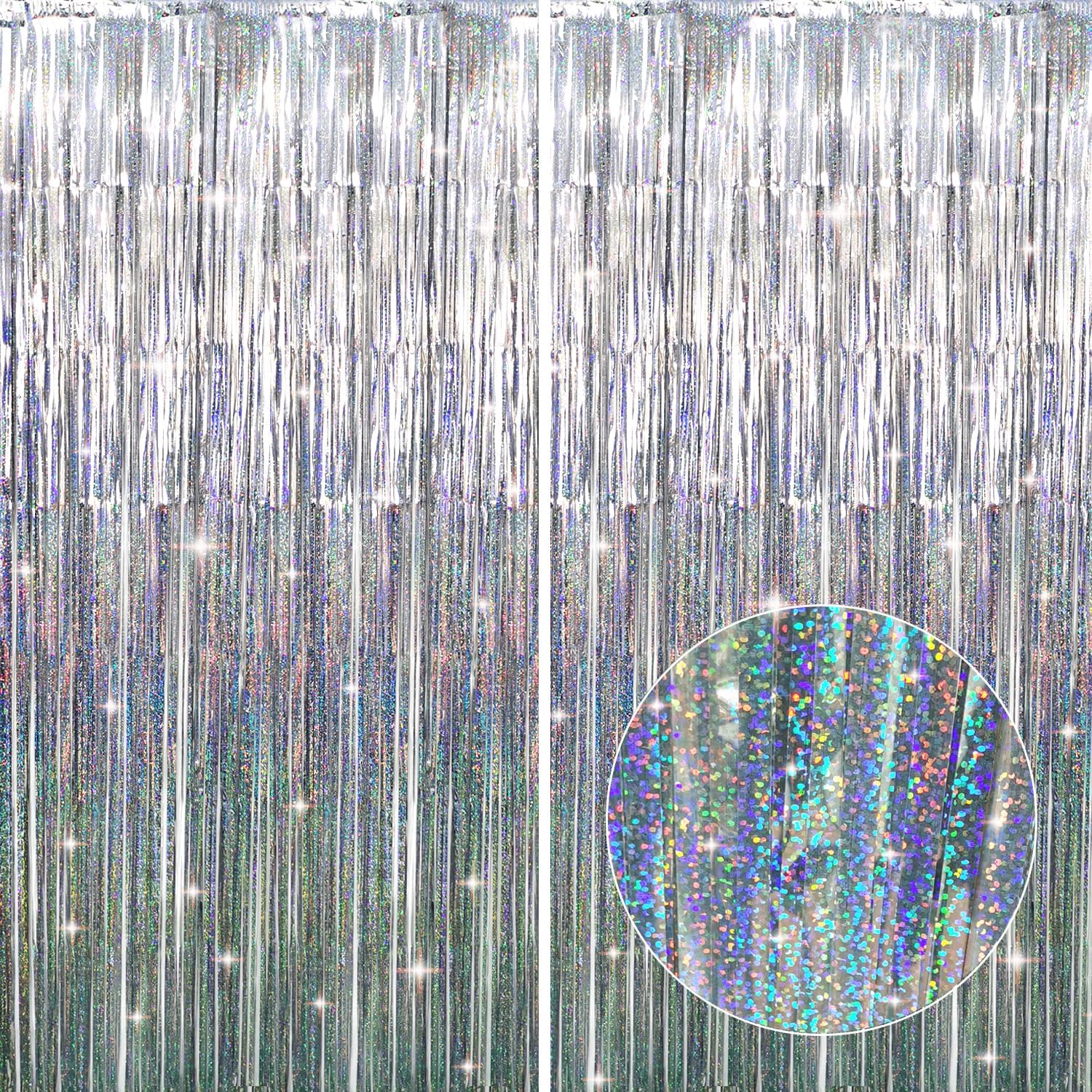 - Package Includes:2 pack shiny silver foil fringe curtains,3.2 ft x 8.2 ft each,suitable for hanging on a door or coverage a wall fully