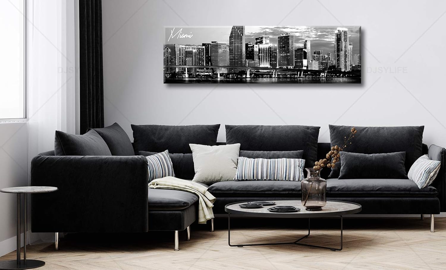 DJSYLIFE Miami Skyline Wall Art Decor Panoramic Cityscape Picture Modern USA City Night View Canvas Prints for Bedroom Office Living Room Decoration Stretched and Framed Ready to Hang 13.8"x47.3"