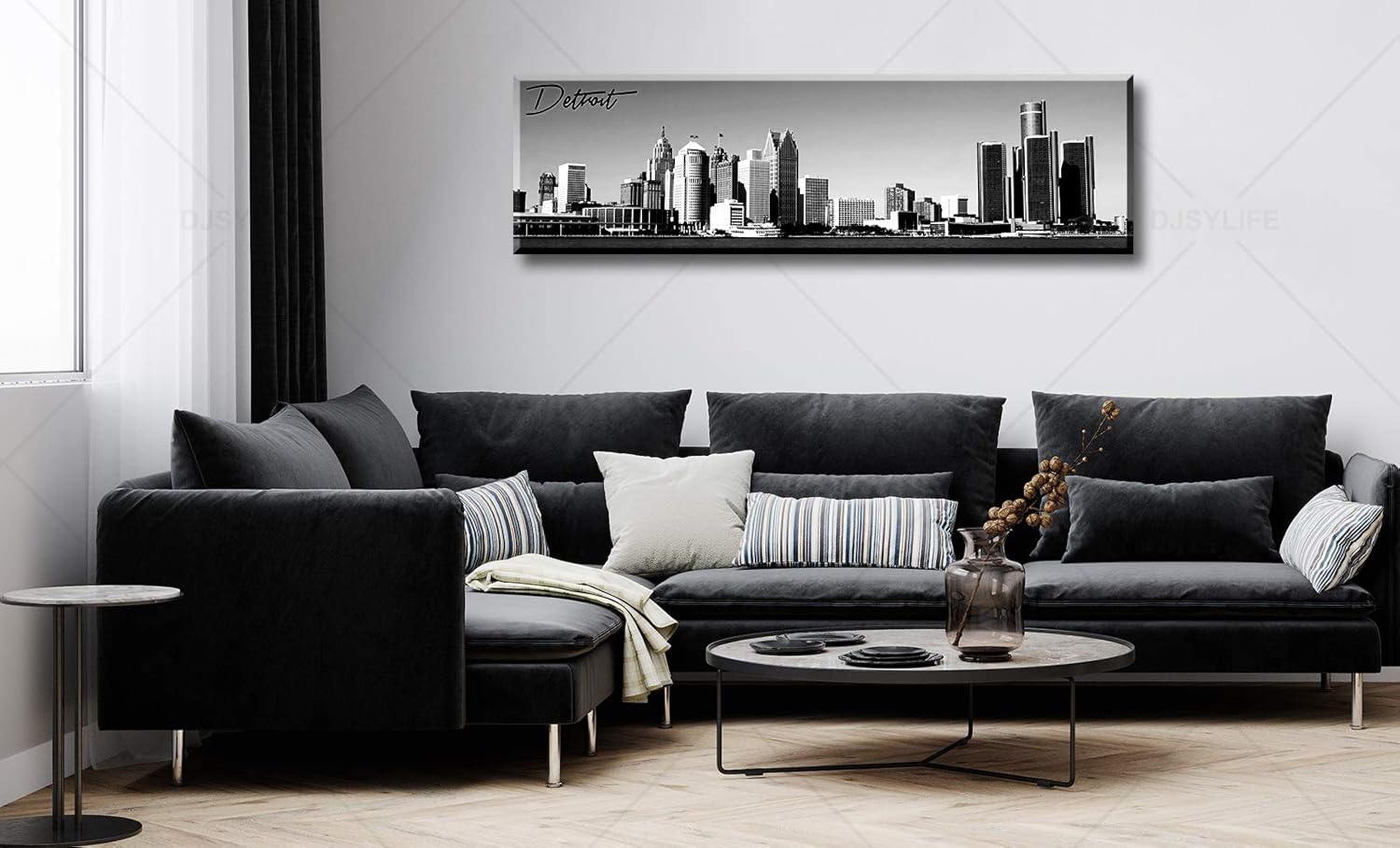 DJSYLIFE Detroit Skyline Wall Art Black and White Canvas Prints USA Skyscraper Panoramic Cityscape Picture for Bedroom Office Home Decoration Ready to Hang 13.8" x 47.3"