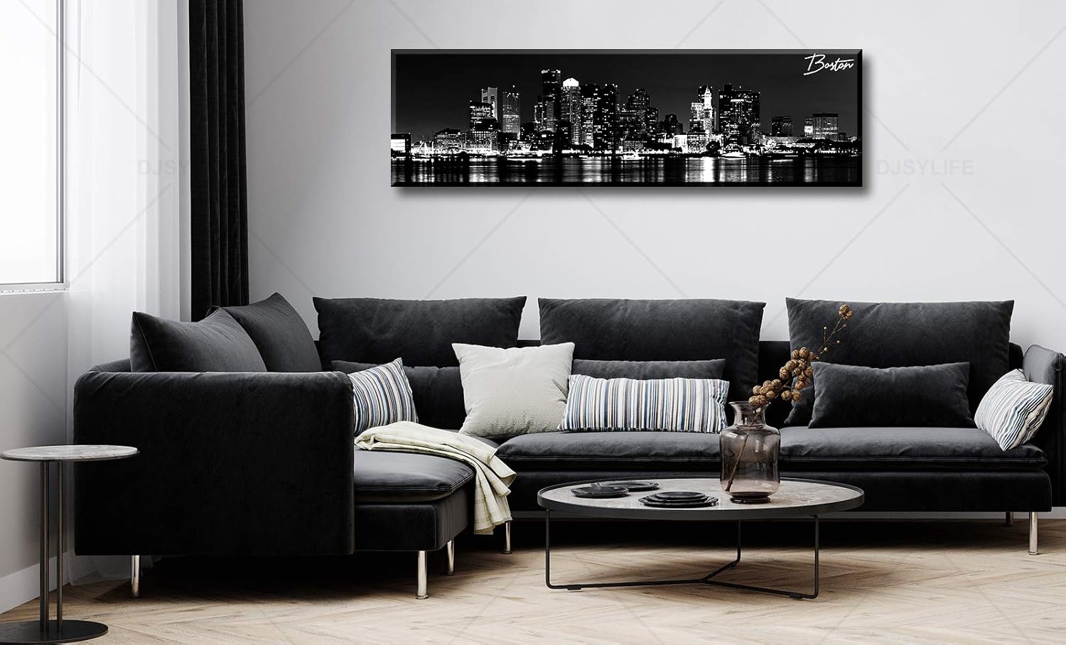 DJSYLIFE Boston Skyline Wall Art Canvas Wall Art Black and White Modern Panoramic Cityscape Pictures Paintings for Bedroom Office Decor, Ready to Hang 13.8"x47.3"