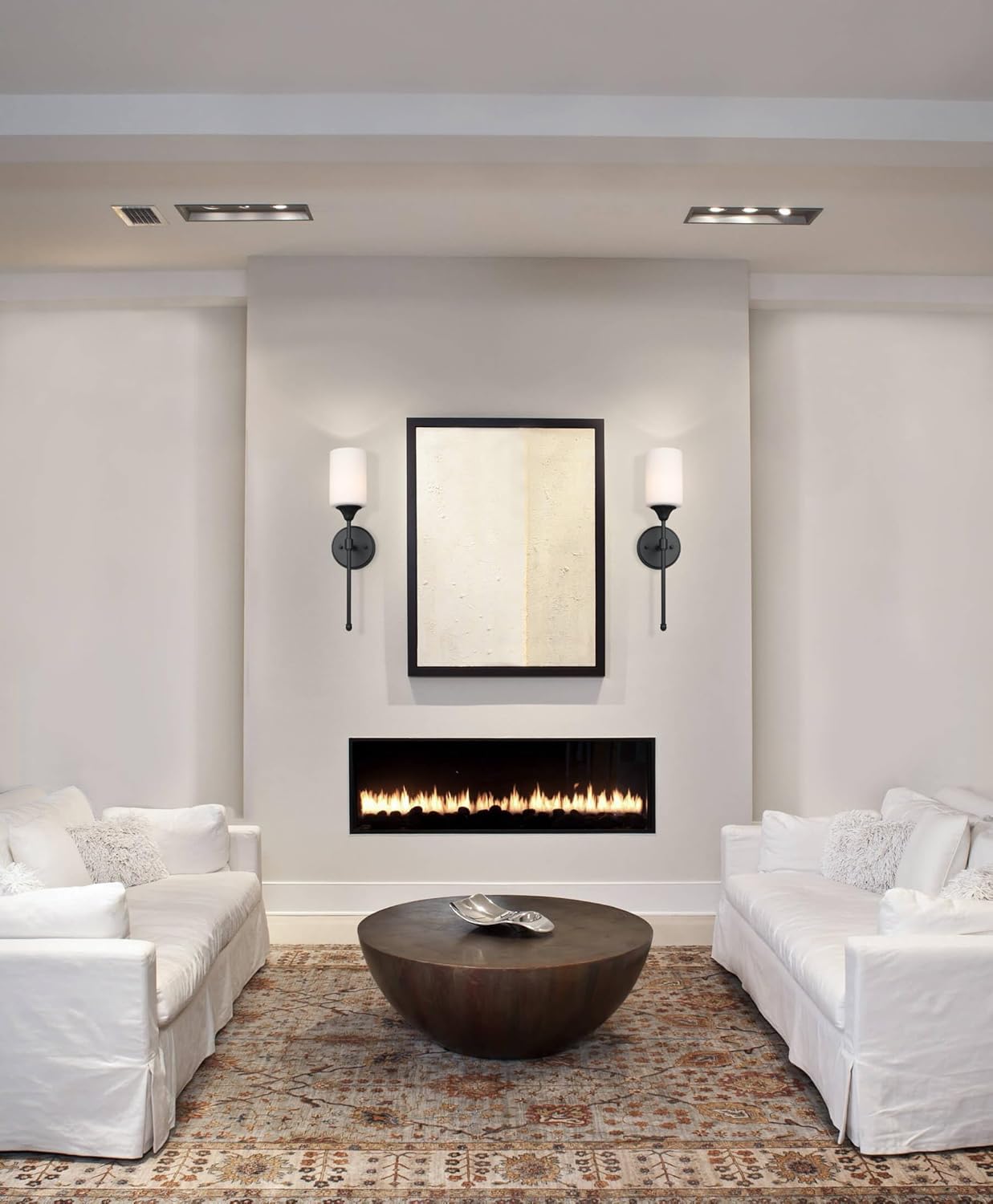 - CLASSIC & TRANSITIONAL DESIGN: modern sconce light pairs simply harware body with white glass shade illumitated a warm light shine to bathrooms, bedrooms, corridors, entryways, kitchen, hallway, dinning and living areas