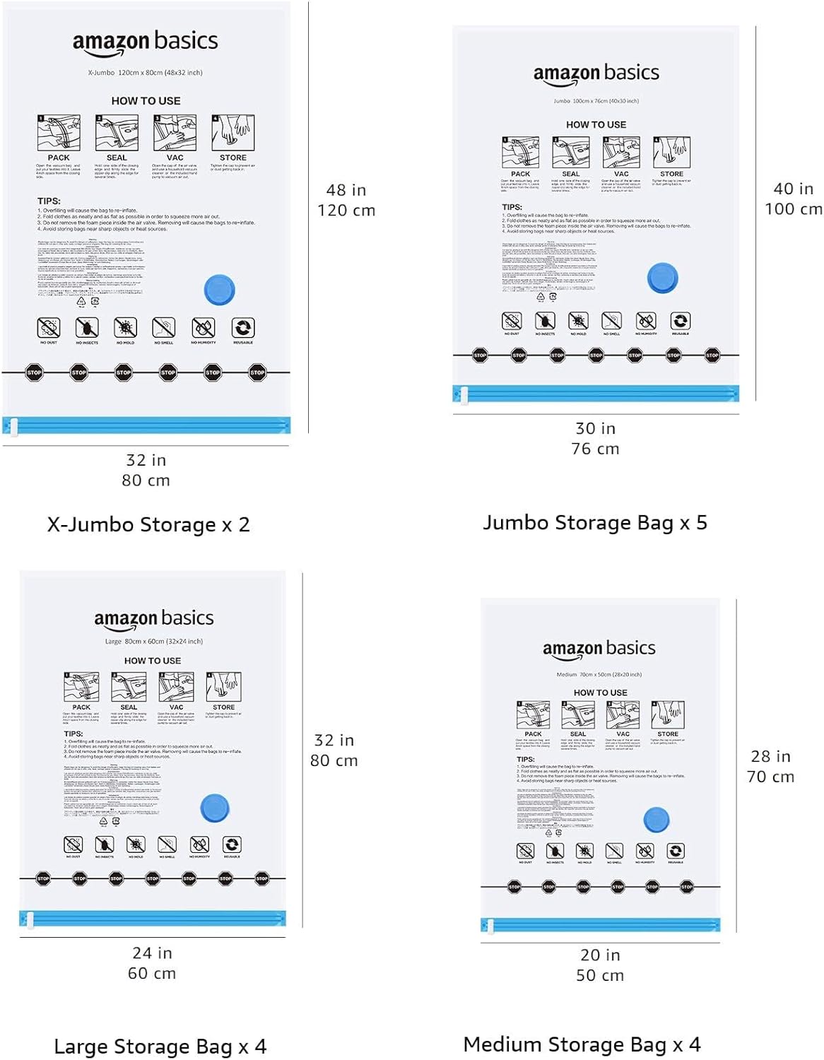 Amazon Basics Vacuum Compression Space Saving Storage Bags with Hand Pump for Clothes Packing, Pack of 15, Multiple Sizes, White