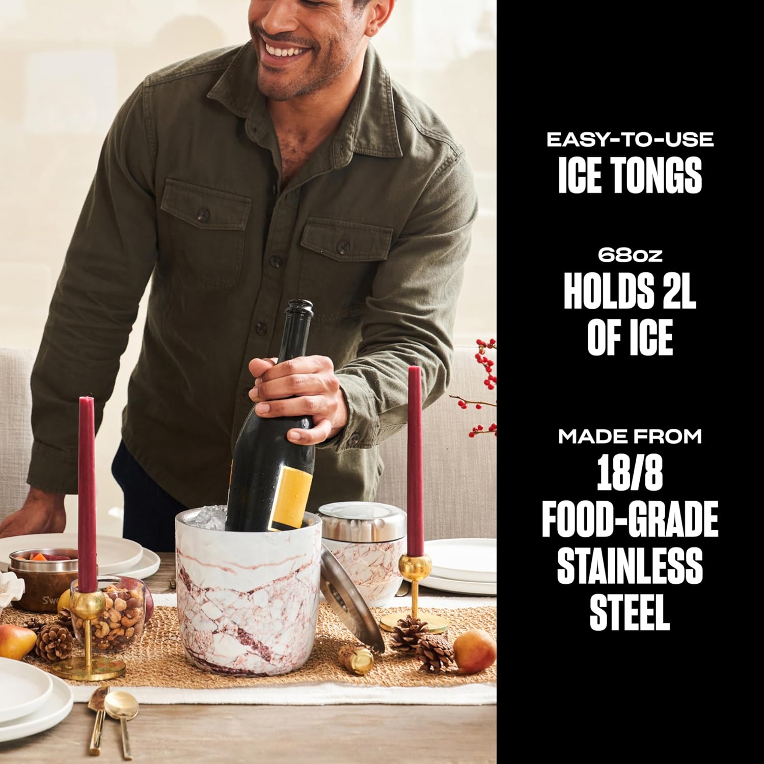 - THE PERFECT FIT: Celebrate stylishly at home or al fresco. Our sophisticated condensation-free ice bucket includes a stainless steel cover and easy-to-use tongs. It can also be used to chill a standard champagne bottle.