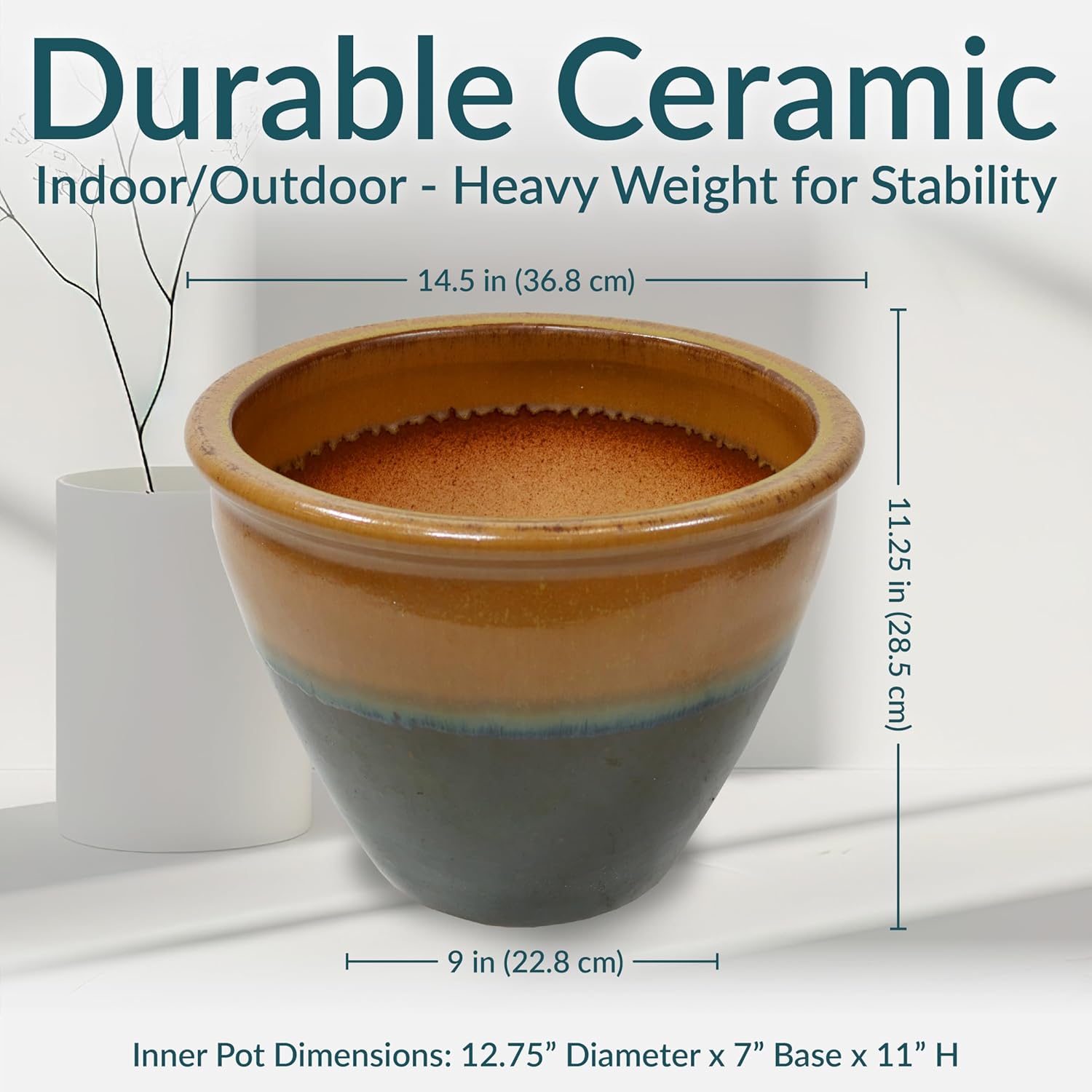 - DESIGNED FOR BEAUTY AND DURABILITY: This outdoor plant pot is crafted with a rich, hand-painted glazed finish that is kiln-fired for a classic, shining appearance. Subtle variations in color highlight the artisanal glazing process, making each piece truly unique. The durable ceramic construction offers natural UV and frost resistance, while its heavy weight adds stability to outdoor arrangements, keeping the planter upright in windy conditions.