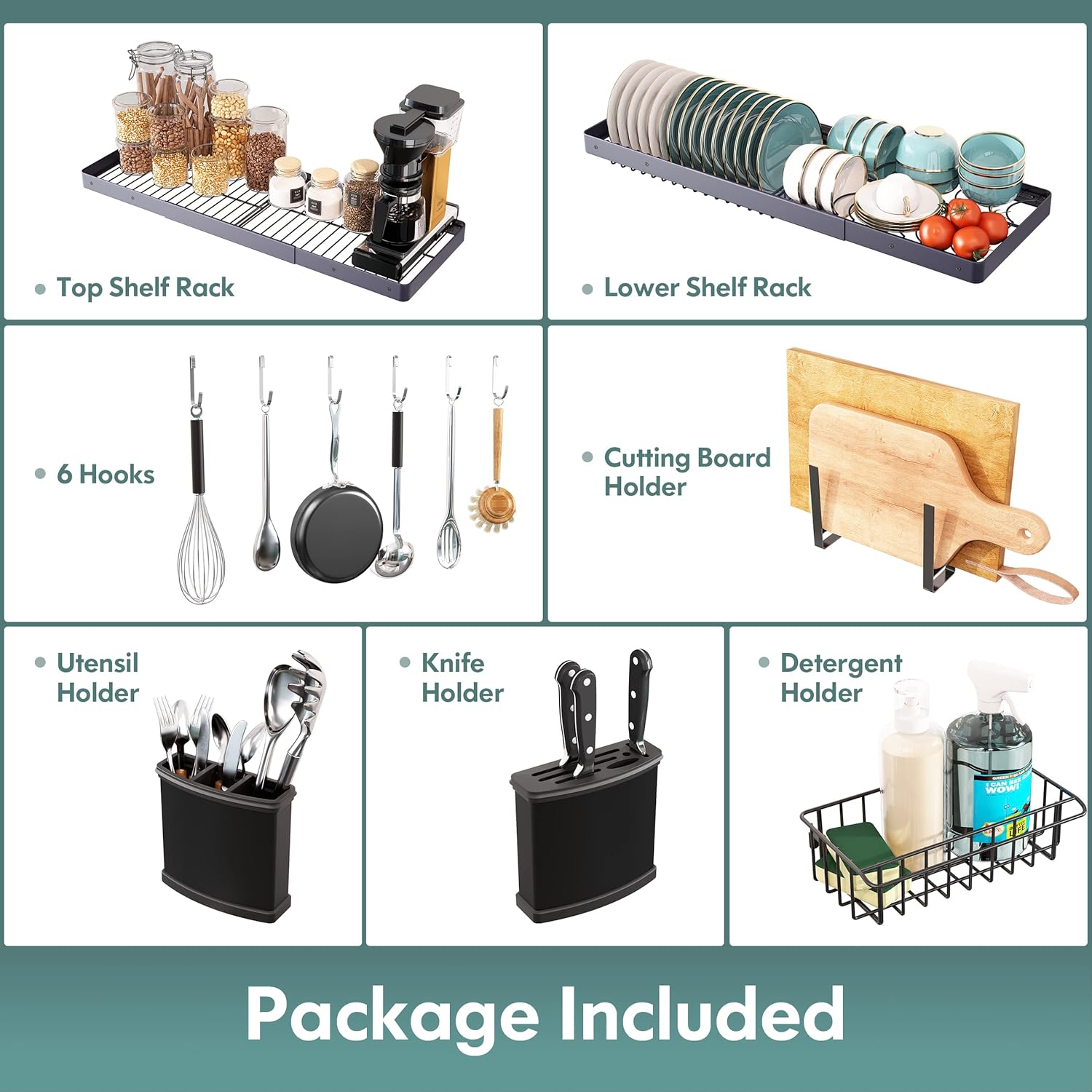 - π Expandable Design for Custom Fit: Adjust the over sink dish drying rack width effortlessly to span most standard single or double sinks, adapting seamlessly to your kitchen layout. The dish drain modular design allows rearranging tiers and accessories to prioritize space for tall glasses, wide pans, or cleaning tools, maximizing vertical storage above the sink