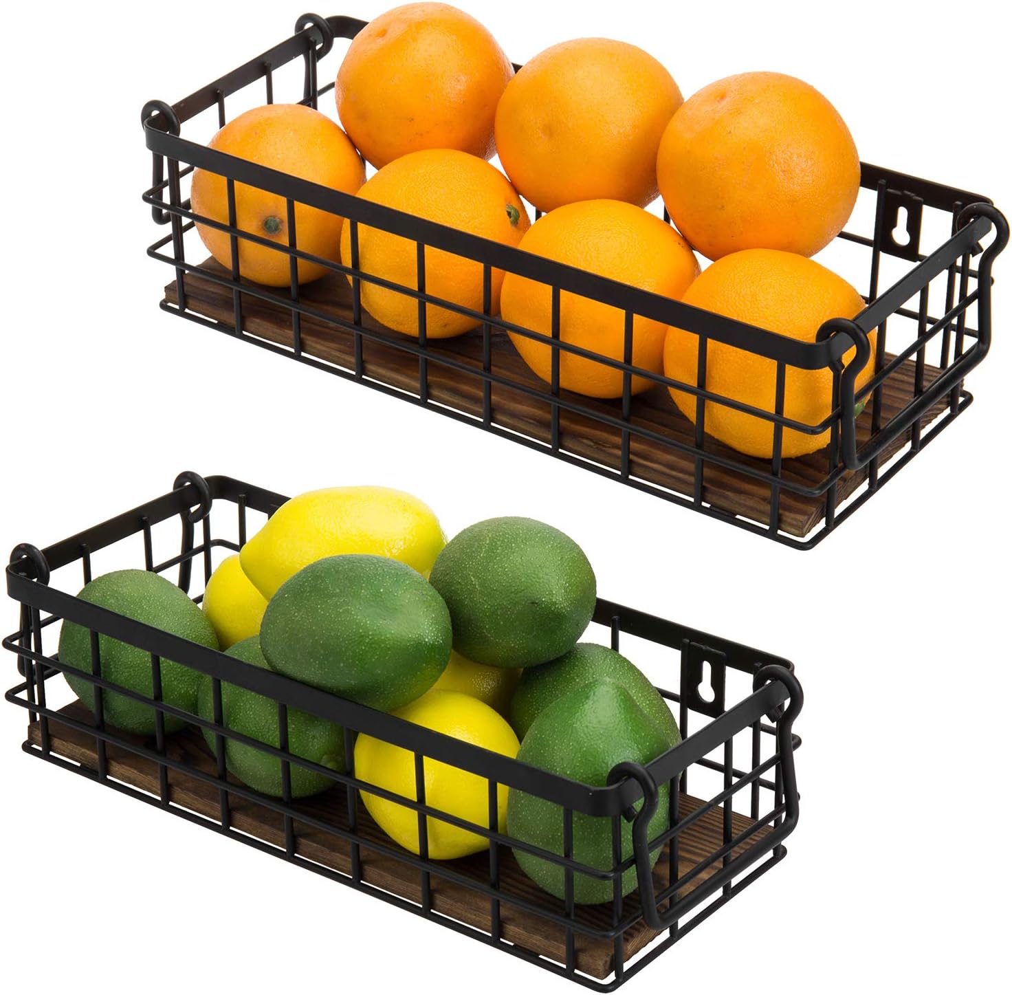 MyGift Set of 2 Wire Baskets for Pantry, Wall Mounted or Tabletop Black Metal Baskets for Organizing with Burnt Wood Base and Handles