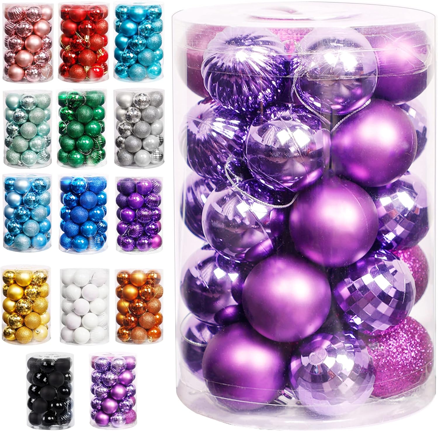 - 34 BALLS WITH 6 KINDS OF SURFACE: Sized 1.57 inch in diameter, Lulu Home purple hanging balls are designed in 6 awesome surfaces: matte, glitter, shiny, mirrored, pumpkin-shaped and unique glass-looking balls. One plastic barrel includes 34 balls in total.