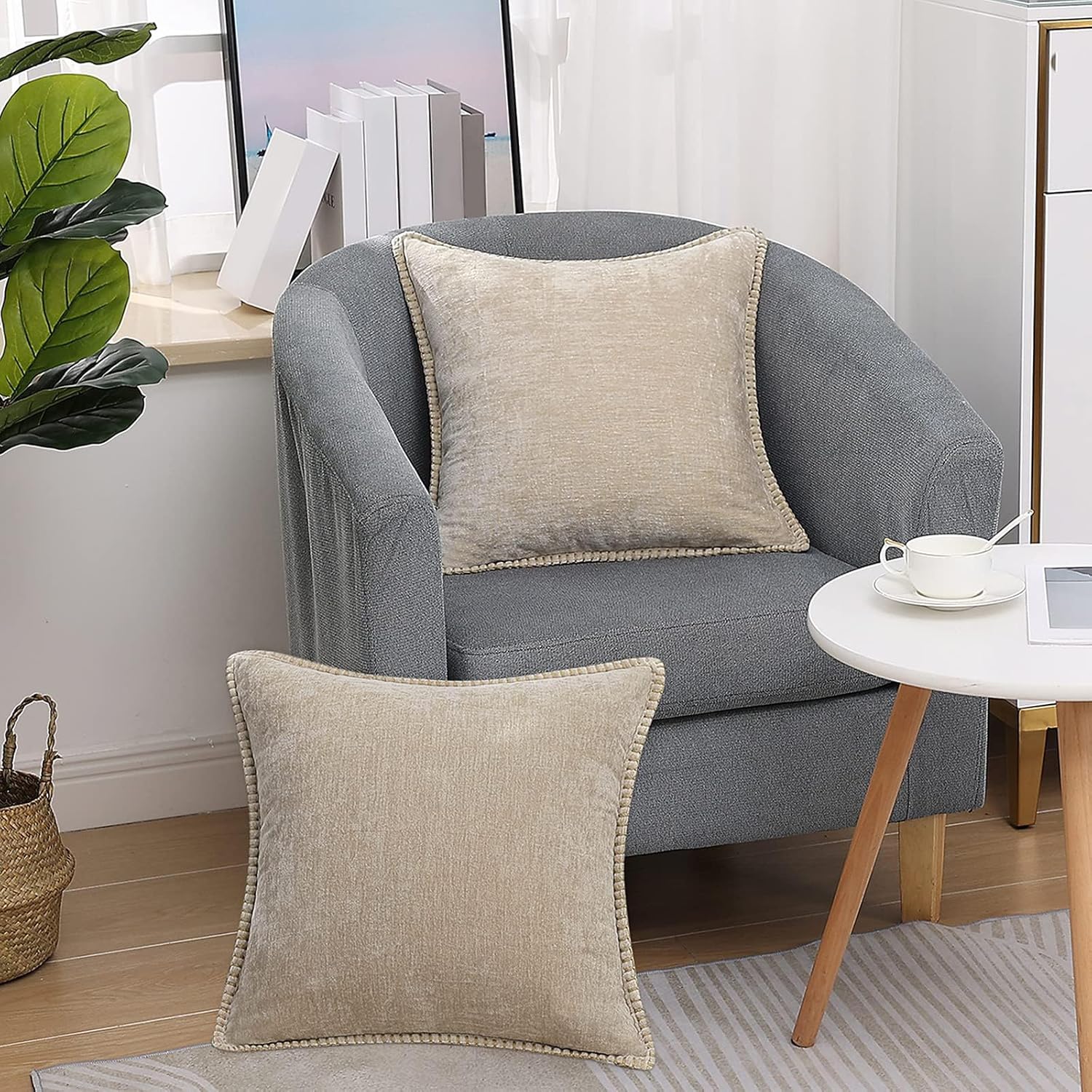 decorUhome Chenille Soft Throw Pillow Covers 24x24 Set of 2, Farmhouse Velvet Neutral Decorative Euro Pillow Covers with Stitched Edge for Couch Sofa Bed Home Decor, Beige