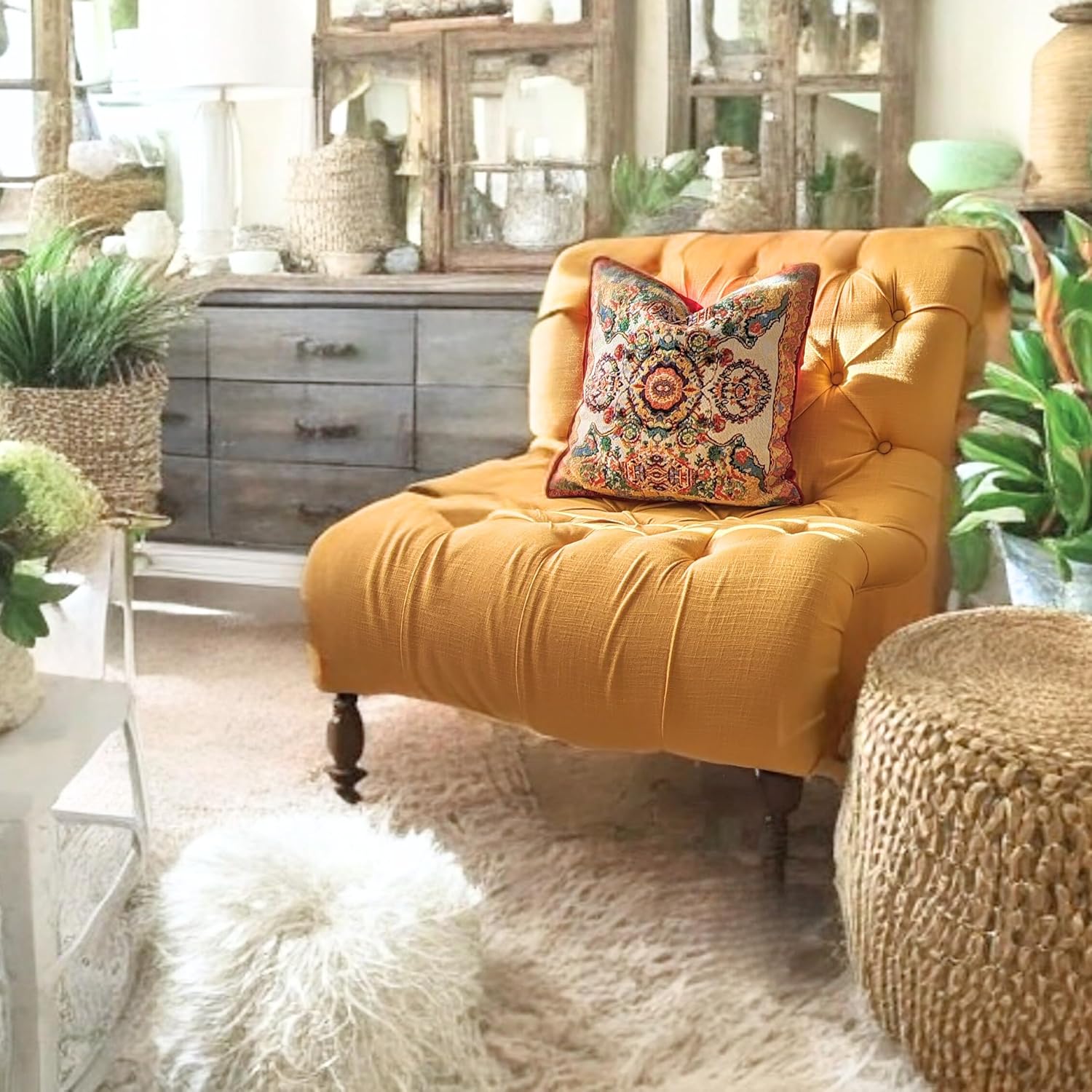 - Fabric: woven cotton linen tapestry faux needlepoint structure