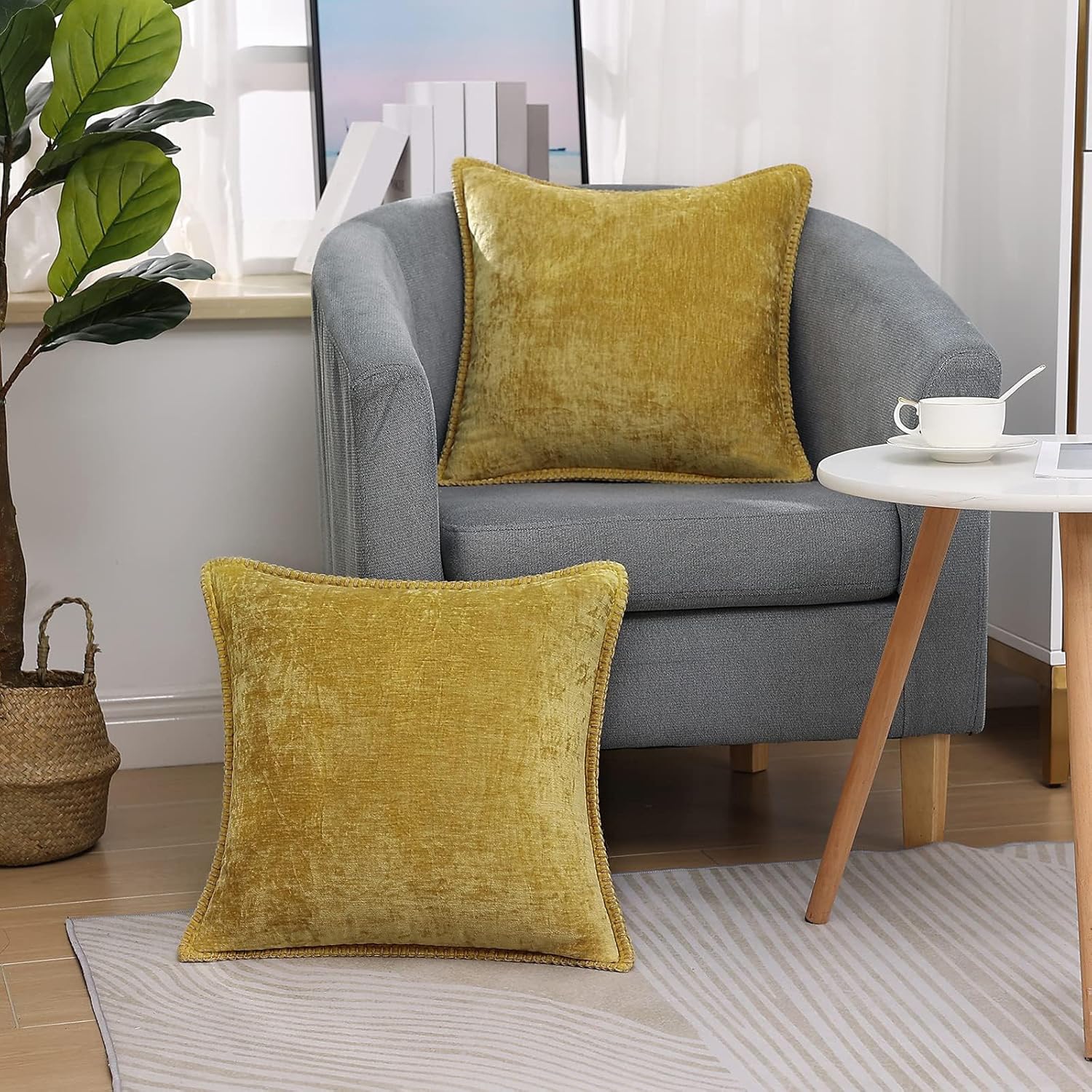 decorUhome Chenille Soft Throw Pillow Covers 26x26 Set of 2, Farmhouse Velvet Neutral Decorative Euro Pillow Covers with Stitched Edge for Couch Sofa Bed Home Decor, Mineral Yellow