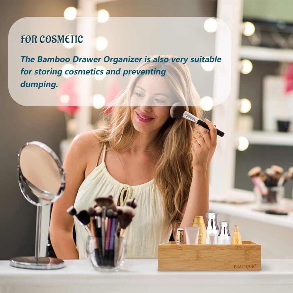 - PRACTICAL STORAGE SPACE:PRATIQUE drawer organizer can reduce clutter and avoid desperately searching for lost items. Ensure drawers in the kitchen and beyond are neat and organized.The flatware organizer is made of bamboo, which has a neutral light wood color and it will look beautiful as your kitchen, closet, garage and office drawer.