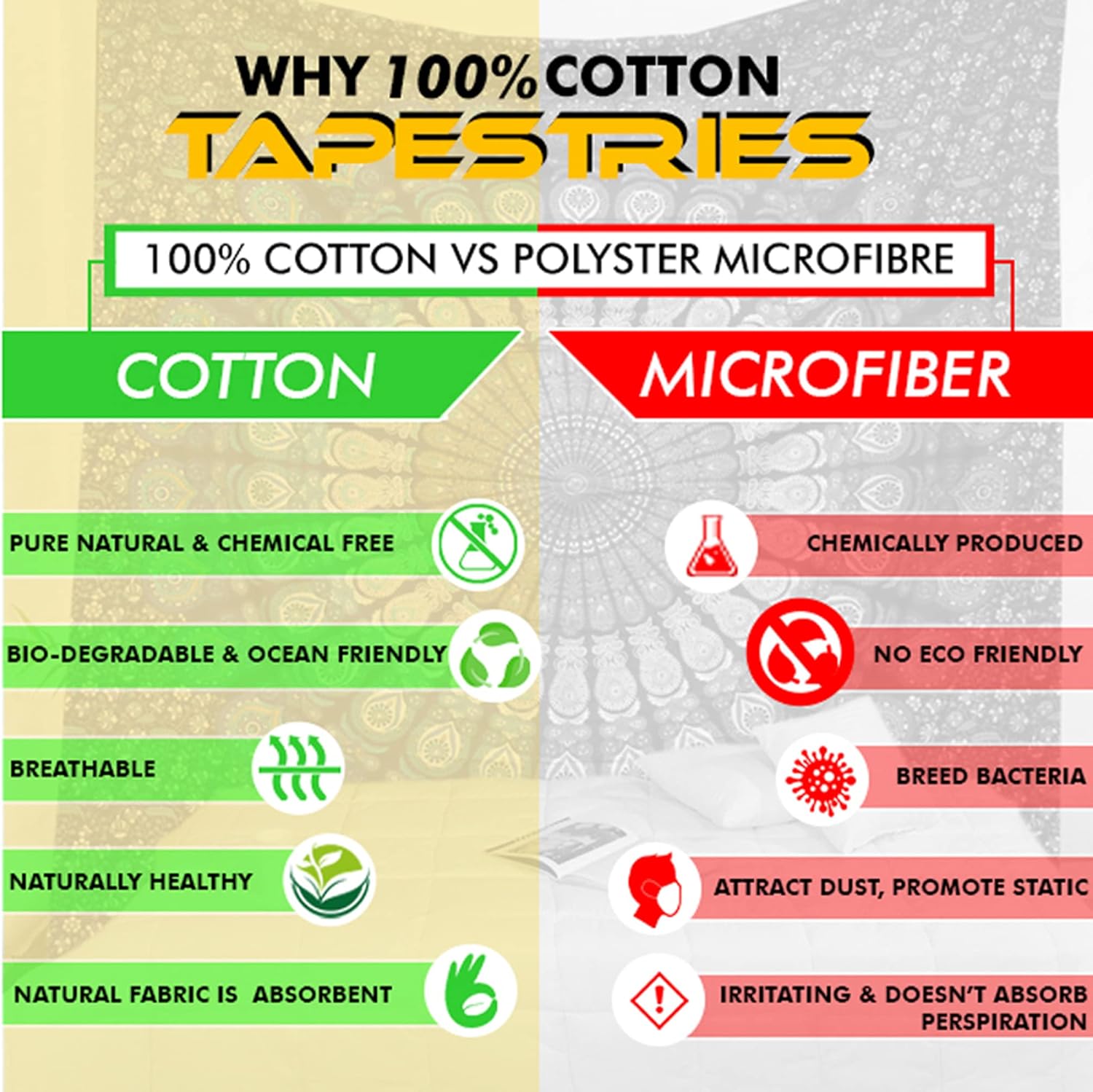 - MATERIAL & SIZE : Mandala boho Tapestry is made of 100% cotton fabric, made and printed in India, With hand sewing, easy to hang, the edges are neat and finished and used for both indoor and outdoor purpose, size Medium (52x60 Inches / 132x152 Cms)