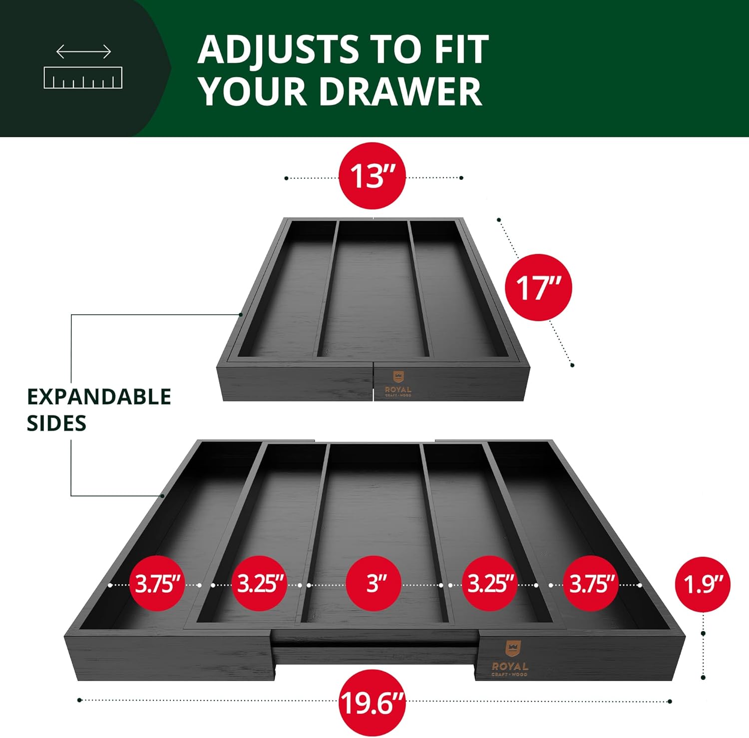 - ๐๐ด๐ฌ๐จ๐บ๐ผ๐น๐ฌ ๐๐ถ๐ผ๐น ๐ซ๐น๐จ๐พ๐ฌ๐น ๐ฉ๐ฌ๐ญ๐ถ๐น๐ฌ ๐ท๐ผ๐น๐ช๐ฏ๐จ๐บ๐ฌ: Please be aware that the Royal Craft Wood Silverware Organizer is a bit deeper and larger than some kitchen drawers. We kindly ask that you MEASURE your home drawer prior to purchase to ensure that this product is a good fit. Please ensure that your drawer space intended to be used with the drawer organizer is LARGER than 20x18โ wide for a guaranteed, comfortable fit when fully expanded