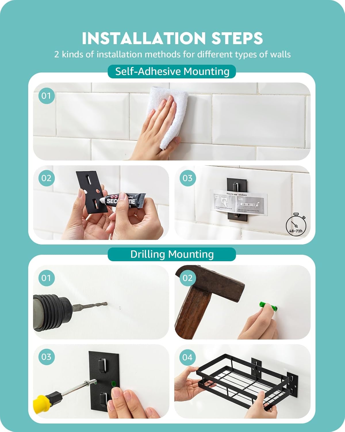 - [TWO WAYS TO INATALL] You can choose the SUPER STRONG ADHESIVE or SCREW to mount the support frame to the wall firstly and then put the floating shelf onto it. All the mounting screws and fixings are included. It is very easy to install.
