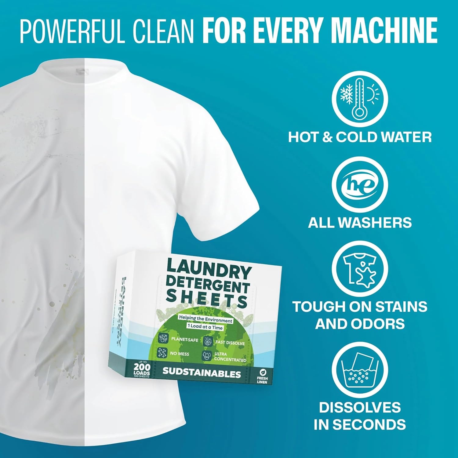 Sudstainables Laundry Detergent Sheets (200 Loads) – Eco-Friendly, Zero Waste, Plastic-Free Laundry Washing Machines Soap Sheets; Dissolvable, Space-Saving Strips for Travel (Fresh Linen)