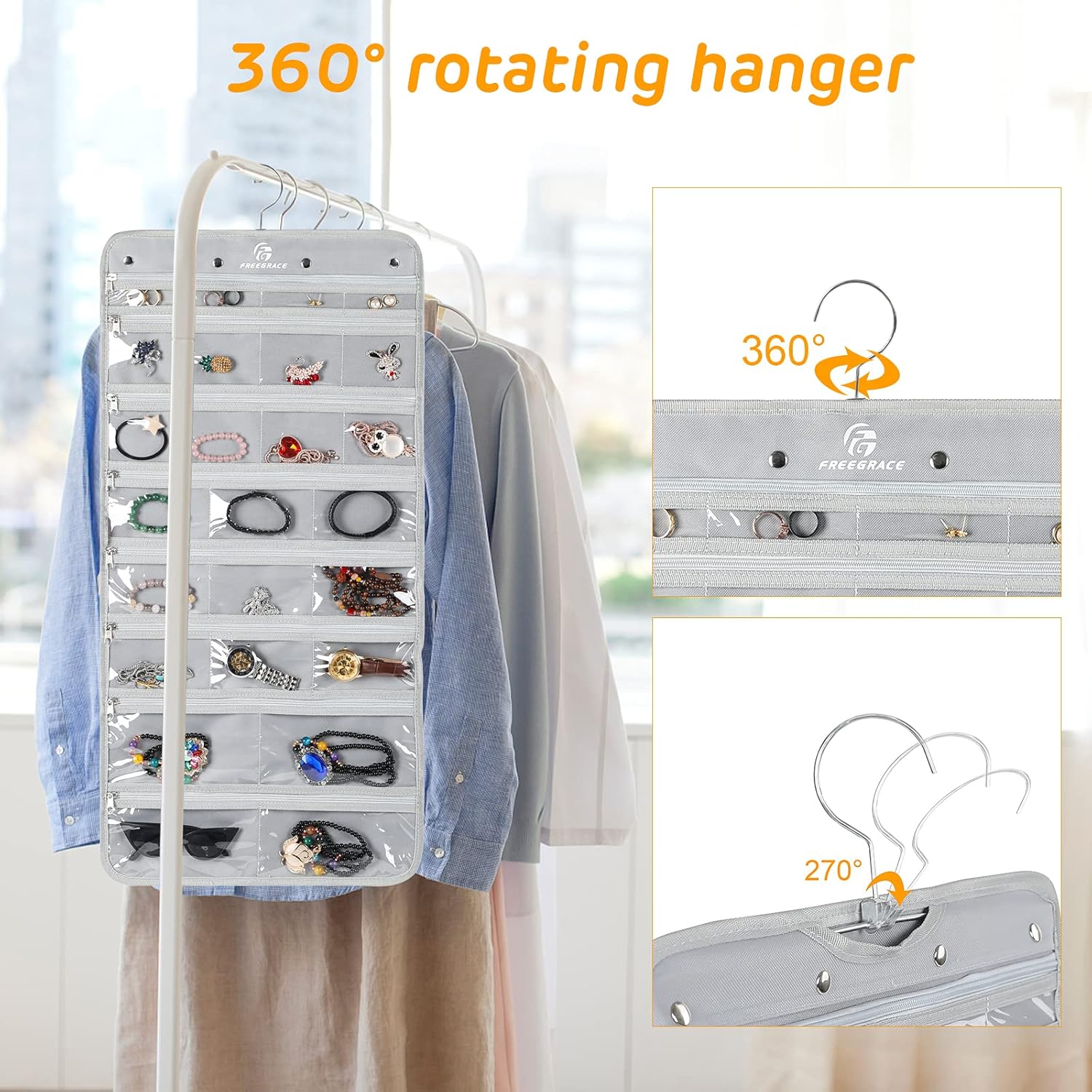 Freegrace Hanging Jewelry Organizer Revolving Hanger - Secure Zipper Closure - 50 Pockets - Foldable Storage & Display Solution - For All Jewelry & Bijoux (Gray)