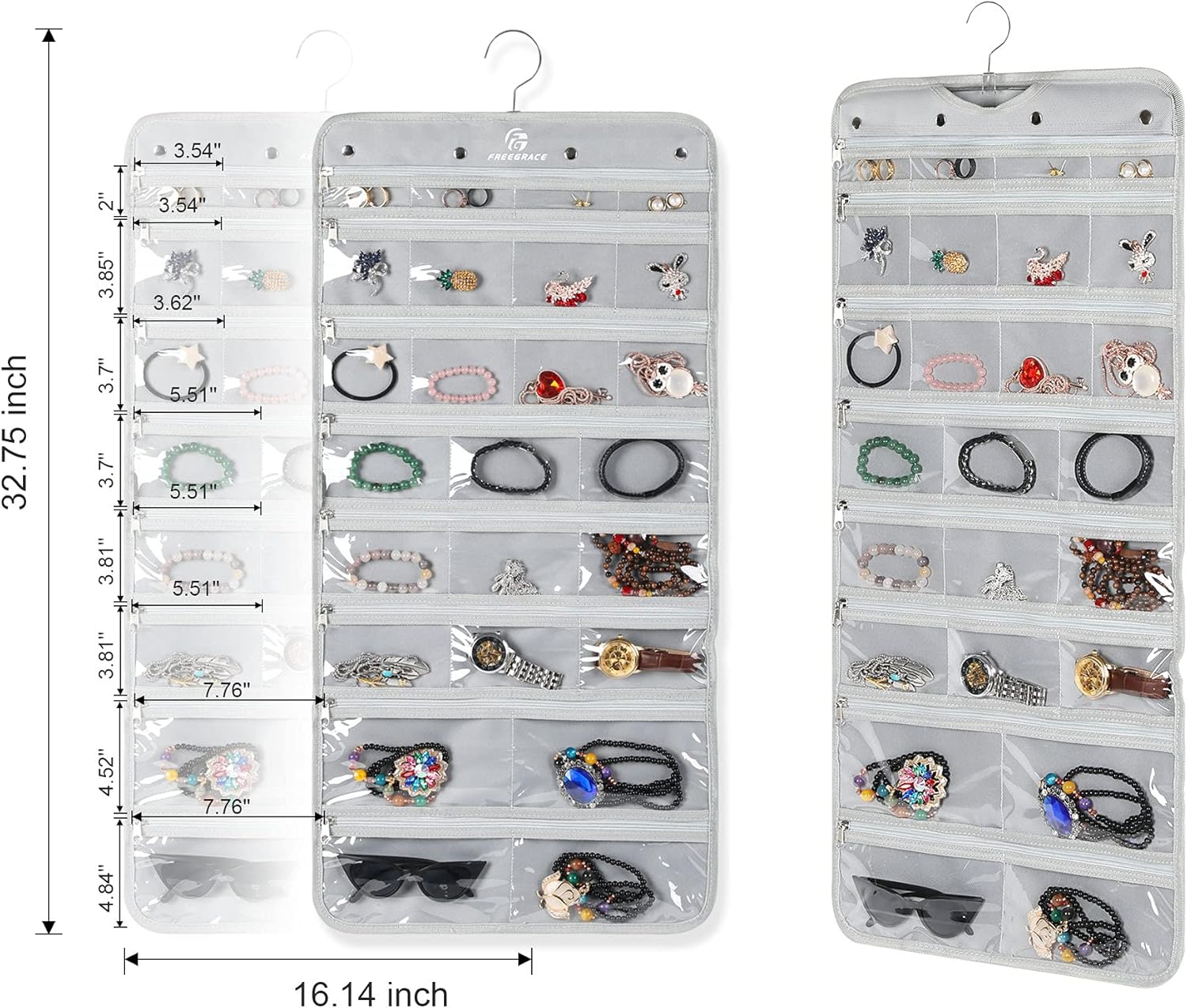 - QUALITY MATERIALS: Freegraceโs sturdy hanging jewelry organizer is made of 600D polyester Oxford fabric and has a PU backing (SIZE: 32.7โโ x 16.5โโ). The pockets are made of transparent PVC to allow you to see through to the stored jewelry, and the zipper and revolving metal hanger are well-made and durable.