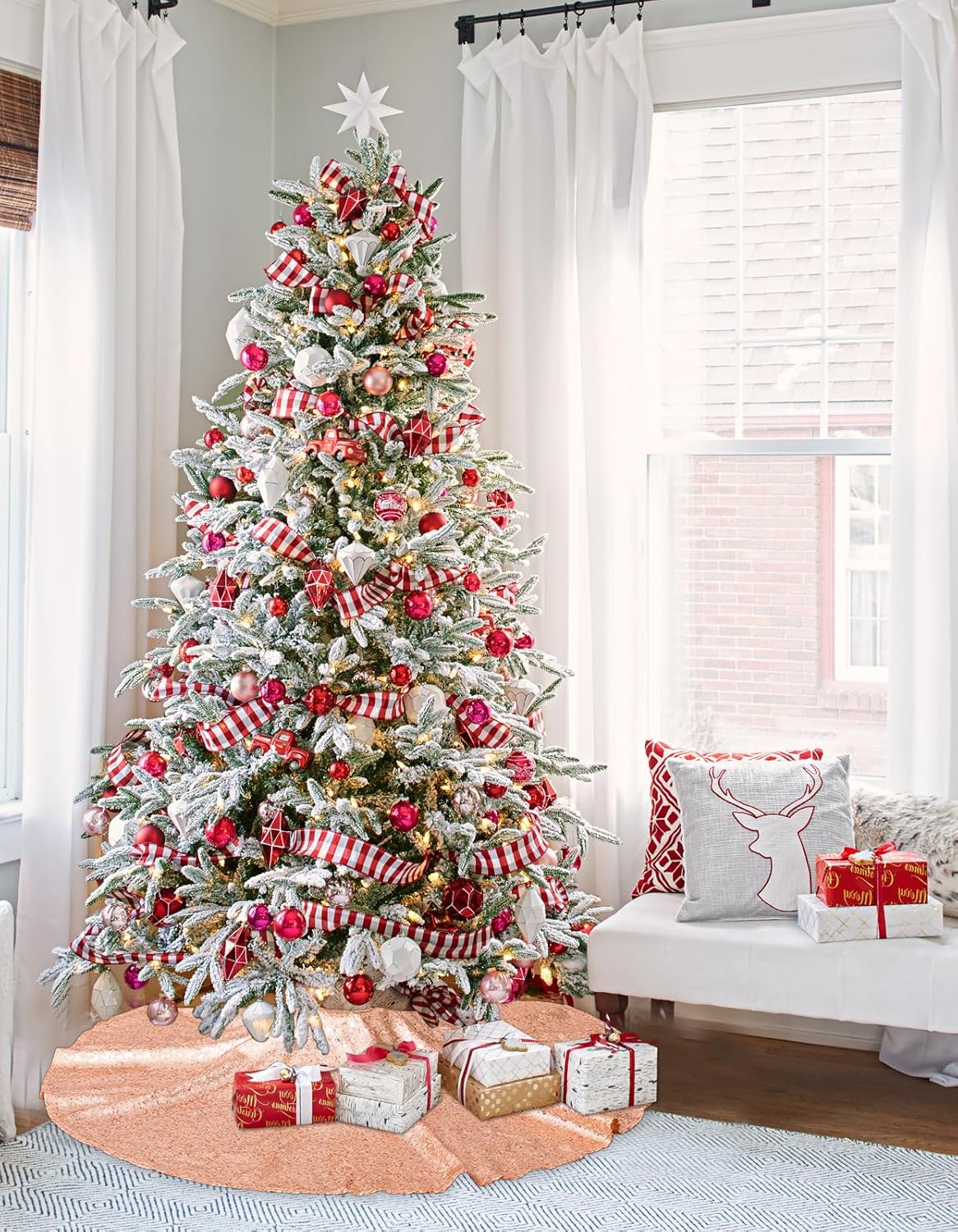 - Rose Gold Sequin Tree Skirt: Christmas tree skirt outer diameter is 48 inch and this xmas tree skirt inner diameter is 3.9 inch.The best matching tree is 6ft - 8ft.