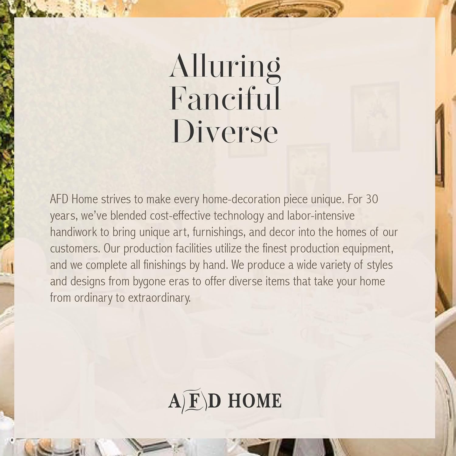 - UNIQUE ART, FURNISHINGS & DECOR: For 30 years, AFD Home has blended technology and craftsmanship to bring elegant pieces into your home. From antique-inspired room accents to reproductions of standout art pieces, weβll always have just the thing that makes your space feel unique.