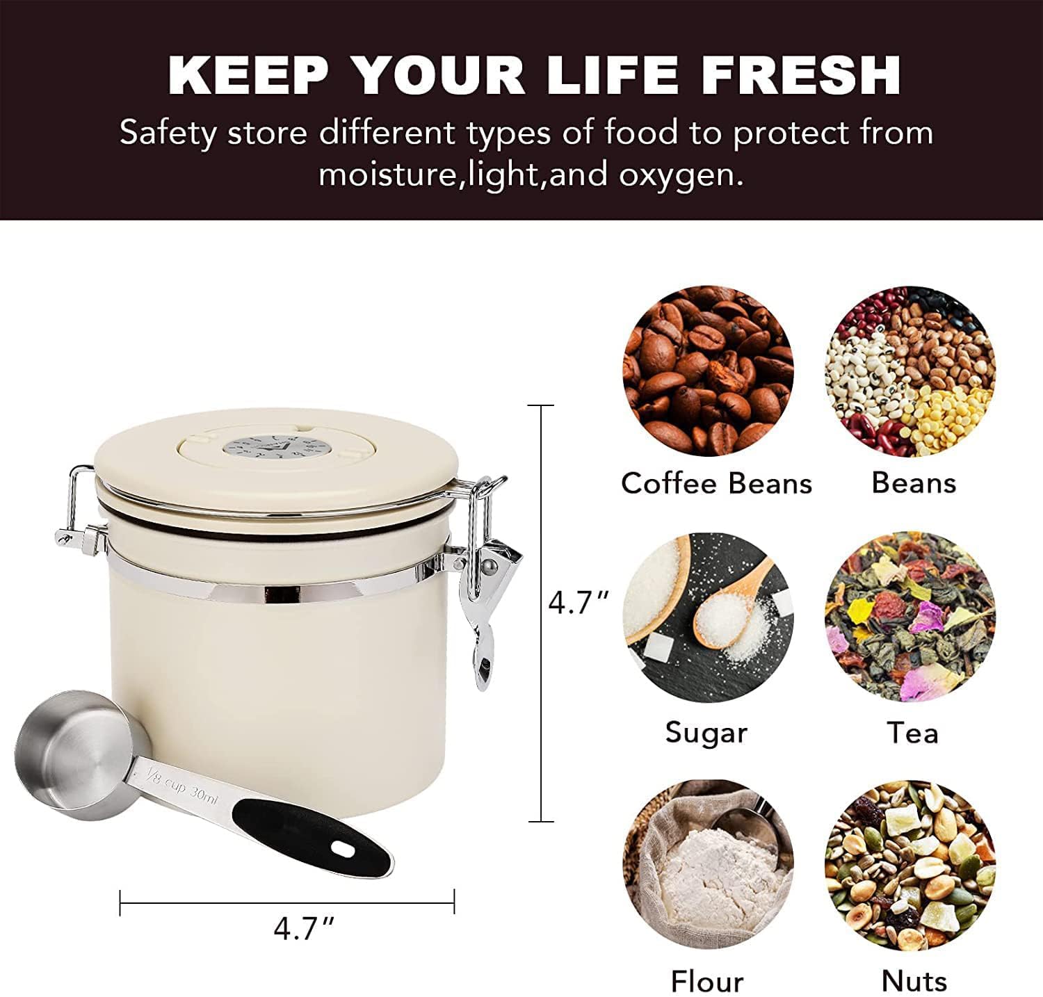 - 【STAINLESS STEEL COFFEE CONTAINER】Made from high-quality 304 stainless steel, the opaque body creates an ideal environment for storing coffee beans. The canister blocks out light and moisture to protect your ingredients—whether they’re coffee beans, dried nuts, or other pantry staples.Its robust construction offers long-lasting durability.