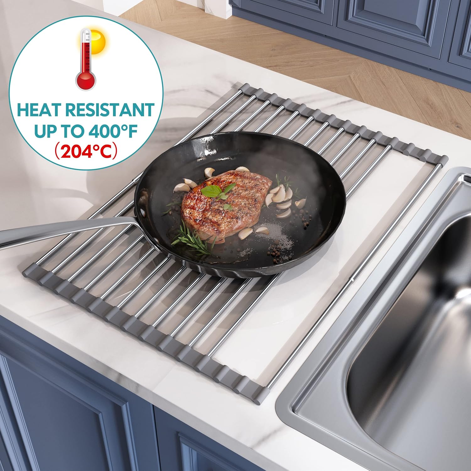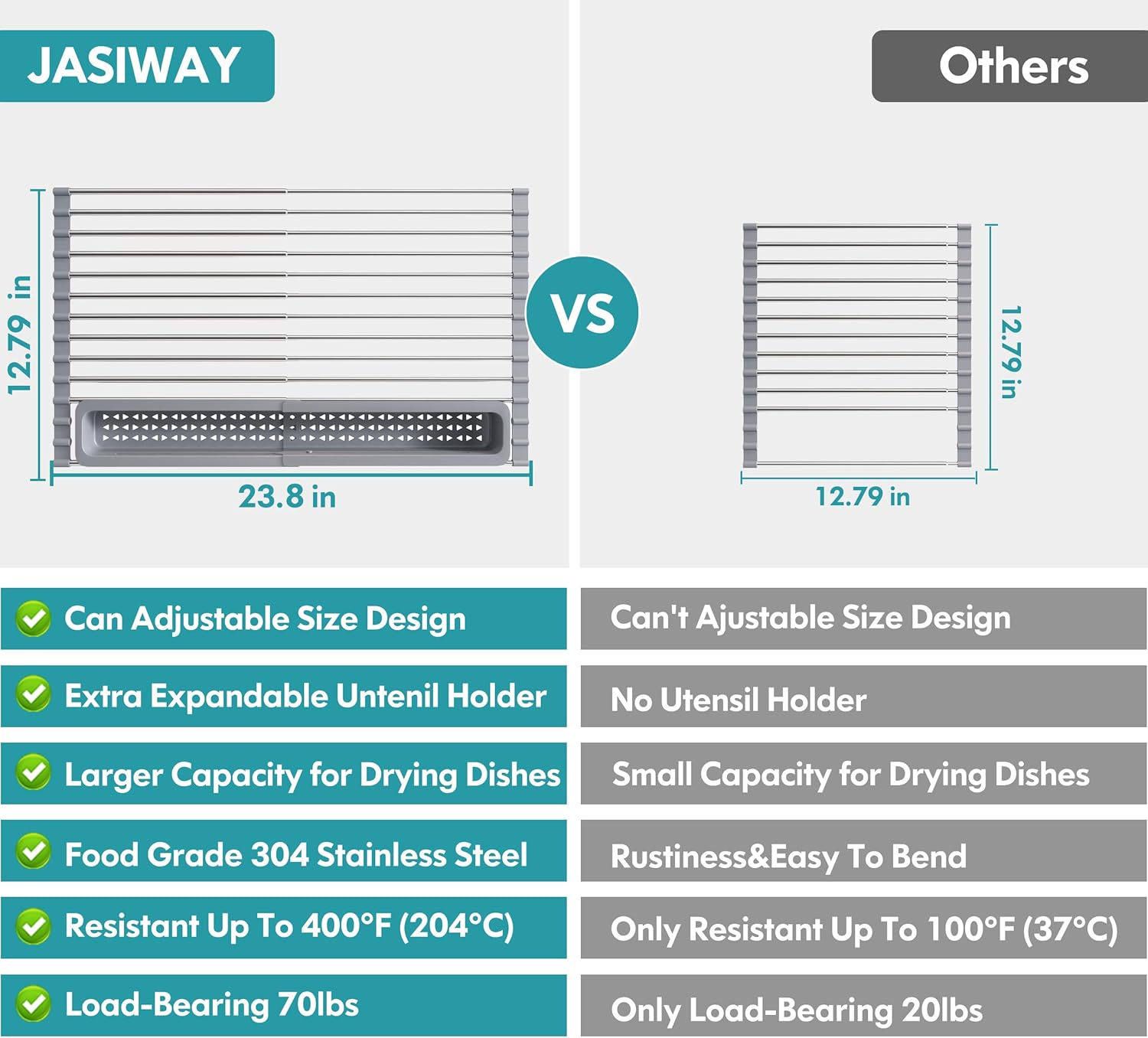- Top Grade 304 Stainless Steel: Our foldable dish drying rack is made of 304 stainless steel, BPA-free food-safe silicone, which is sturdy, rust-resistant, corrosion-resistant, anti-slip, waterproof, high load bearing up to 70lbs, not easy to bend or twist by heavy cookware. Moreover, Heat resistant up to 400Β°F (204Β°C), dishwasher safe. What's more, the non-slip silicone on the edges holds it flat, even, and steady. Strong enough and large capacity to dry kitchen supplies.