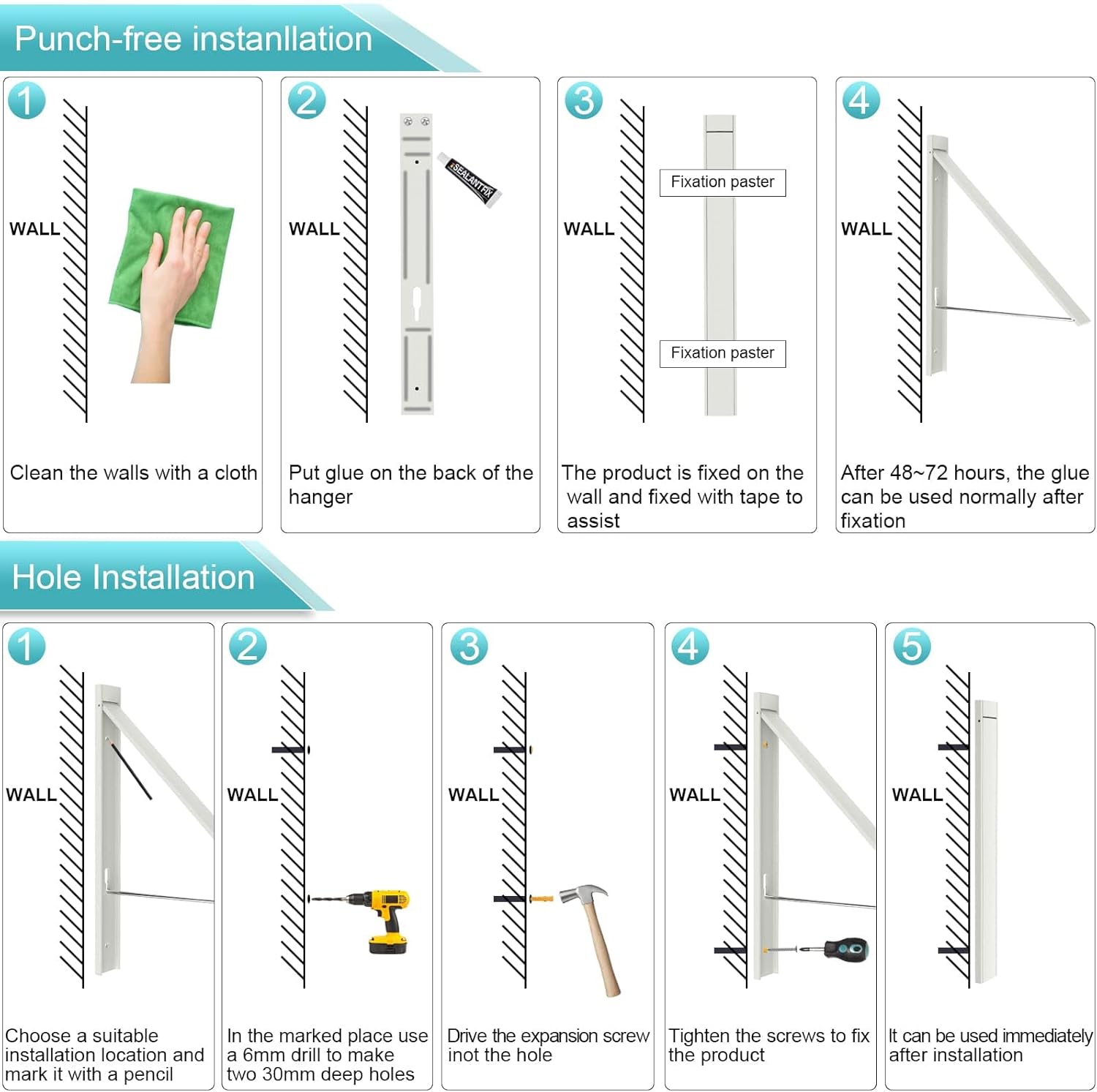 - EASY INSTALLATION:We provide you with two installation methods, if you install the drying rack on the door, glass, tile wall and other smooth walls, you do not need to punch. If you want to mount a folding hanger on a lime wall, we provide you with two screws.