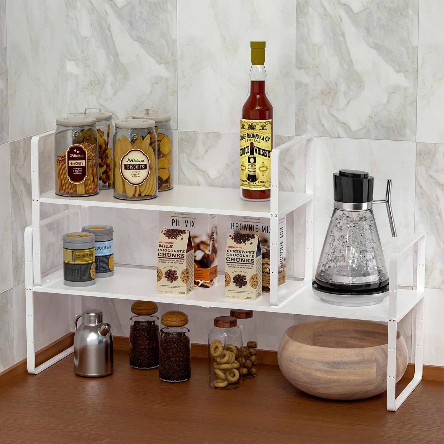 - 【Expandable and stackable design】--The Adjustable Countertop Organizer (collapsed) each measures 16.7" L x 10.2" W x 9.8" H, expands from 16.7" to 27.2" length. You can also stack two shelves together to create a two-tier storage space.