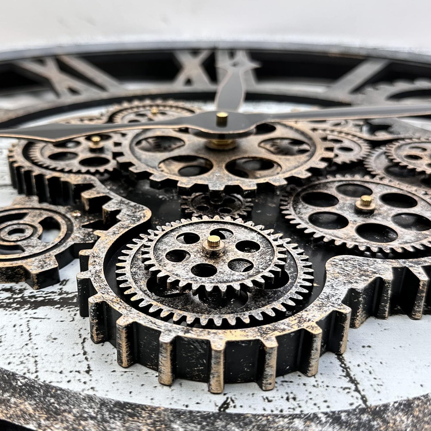 - ăReal Moving Gear ClockăAll gears for the wall clock are real moving! Design with rustic bronze-color and industrial style. An creative combination of four gears for a retro look, has a very exquisite decorative effect makes the wall clock become a chic art works. The large wall clock crafted of nature wood & MDF. Big roman numeral numbers and wood rustic moving gears perfect for any room decor.