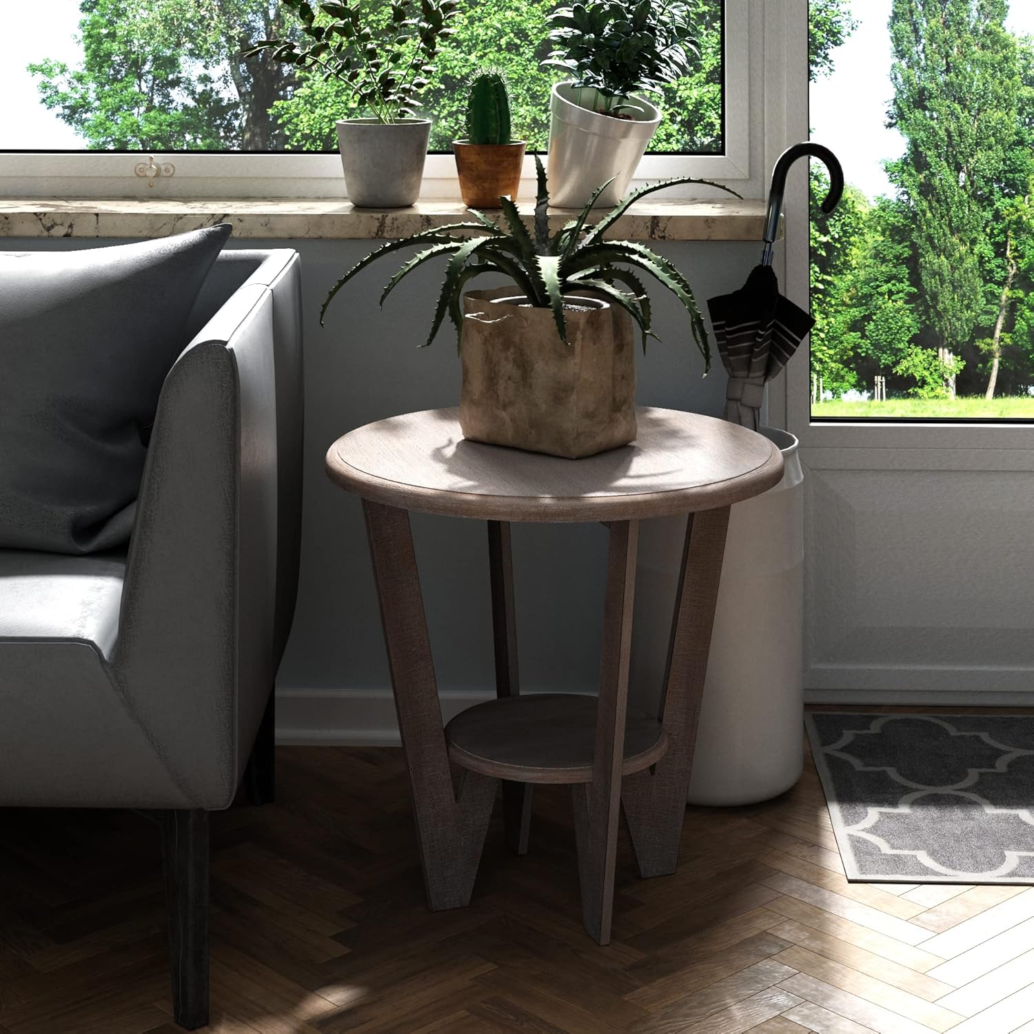 - âś…This unique end table has plenty of room for a few books or an accent lamp up top, while a lower round shelf can hold a few small things or a petite basket for your remotes.