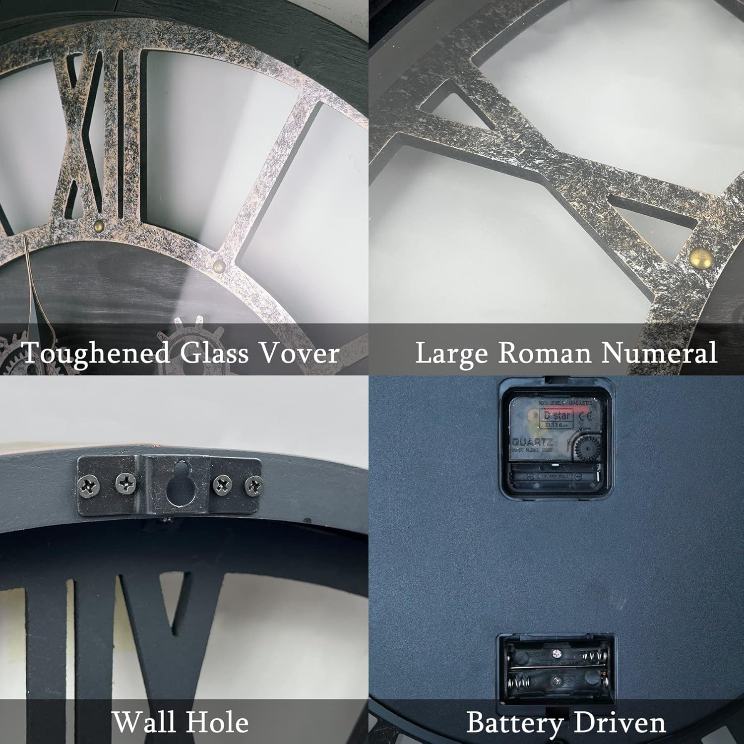 - 🙪Easy to Use: Clock living room decor is simple to operate, with independent pointers and gears powered by easily replaceable AA batteries. We recommend using carbon batteries for optimal performance.
