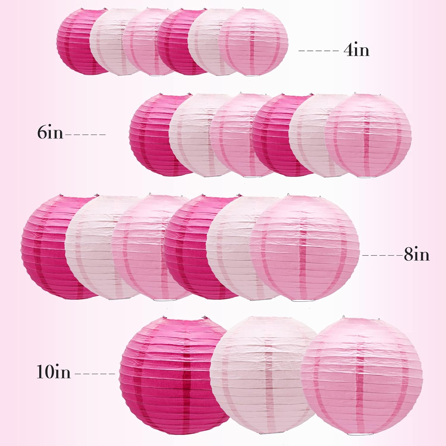 - PAPER LANTERNS SETS CONTENT - 3 Assorted baby pink, pink, hot pnk paper lantern value combination pack of 21 pieces assorted size ranging from Small to X-Large. You will receive 6 pcs of 4 Inch Lanterns, 6 pcs of 6 Inch Lanterns, 6 pcs of 8 Inch Lanterns, 3 pcs of 10 Inch Lanterns. These Chinese lanterns can be matched with many scenes and themed party decorations to create a distinctive party decoration and make the party more unique