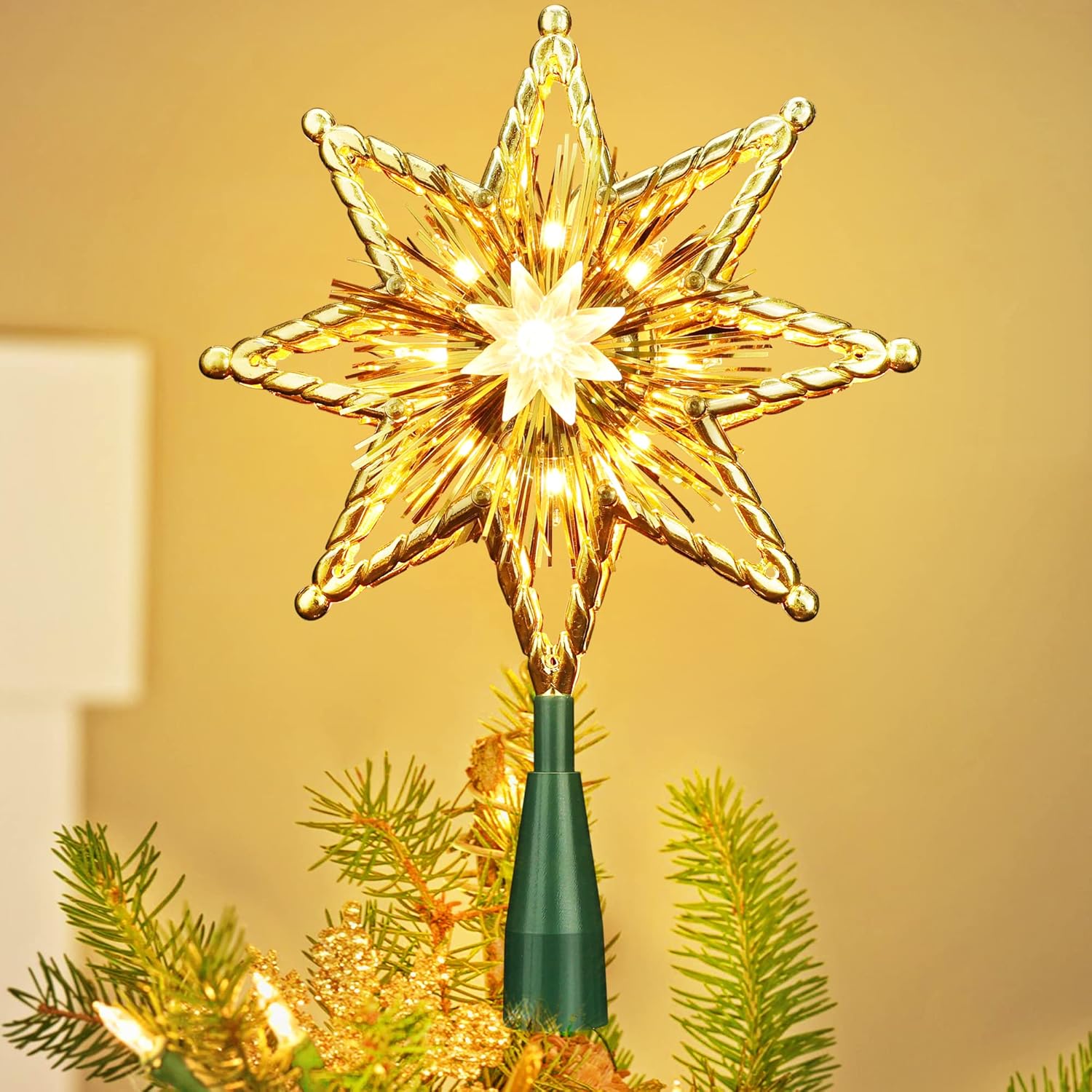 - Beautiful Warm White Lighting: 10 count warm white glowing incandescent lights entwined with star, the Christmas star topper glitters under the lights, beautiful and eye-catching, creating a classic warm and romantic Christmas atmosphere, making your Christmas tree more attractive.