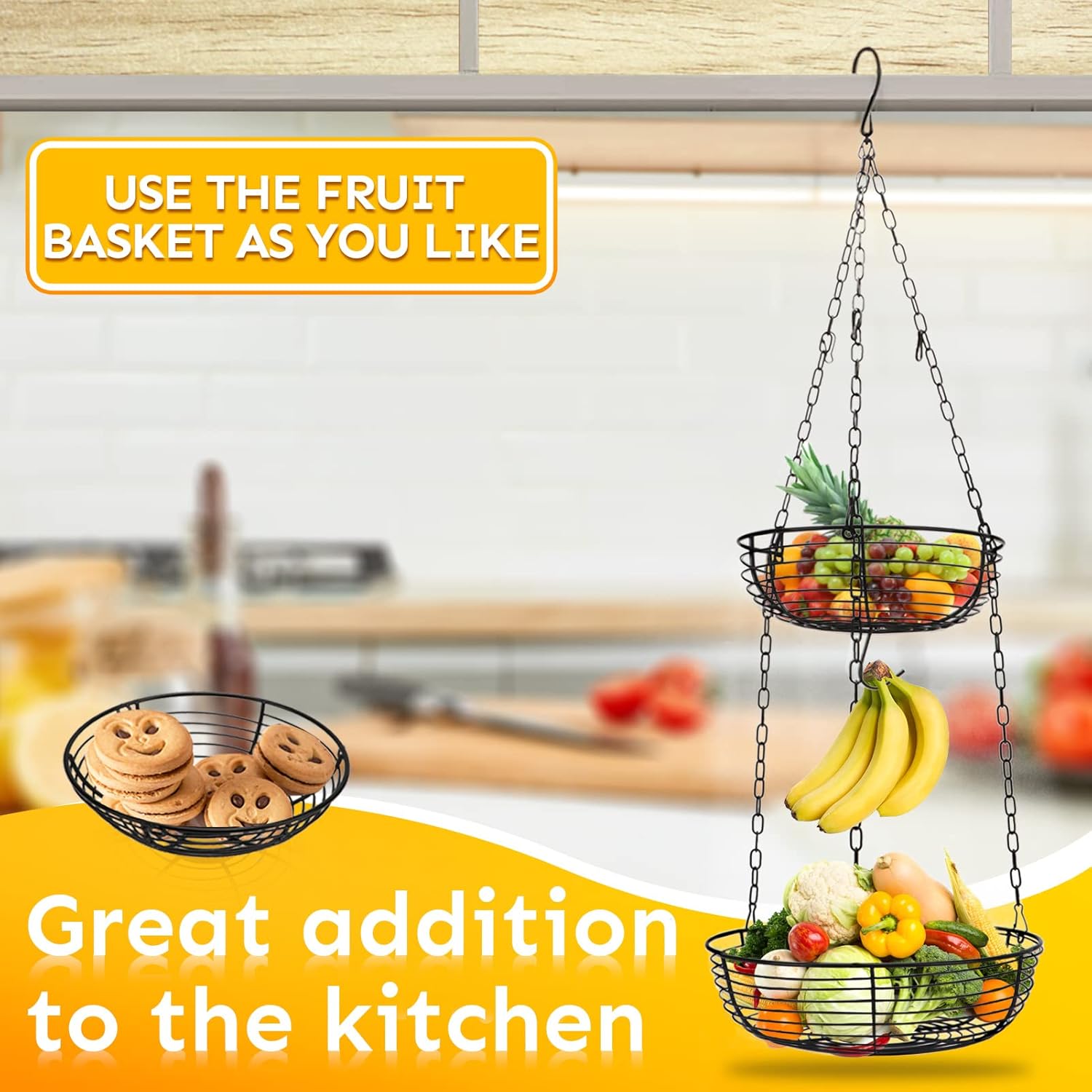 - Heavy Duty Wire Kitchen Basket: Vertical installation, better control of the height of the metal fruits basket. Round metal piece added to the bottom of the hanging basket to effectively prevent small fruits from falling. Elegant and minimalist design that is both functional and decorative. Three tiered hanging fruit basket can change the overall look of kitchen, especially small ones where storage and counter space is limited.