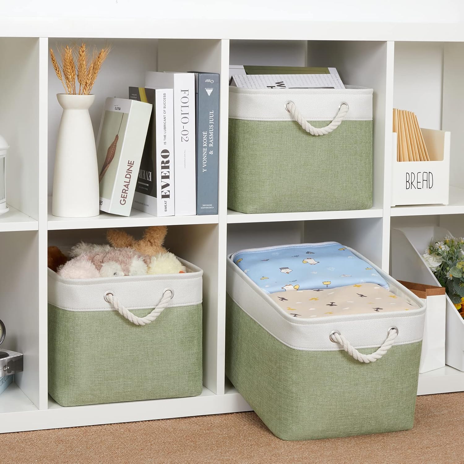 Bidtakay Large Fabric Baskets for Organizing [3-pack] Closet Organizers and Storage Baskets for Gifts Empty Foldable Nursery Baskets for Toy Storage 15 X 11 X 9.5 Inches (White&green)