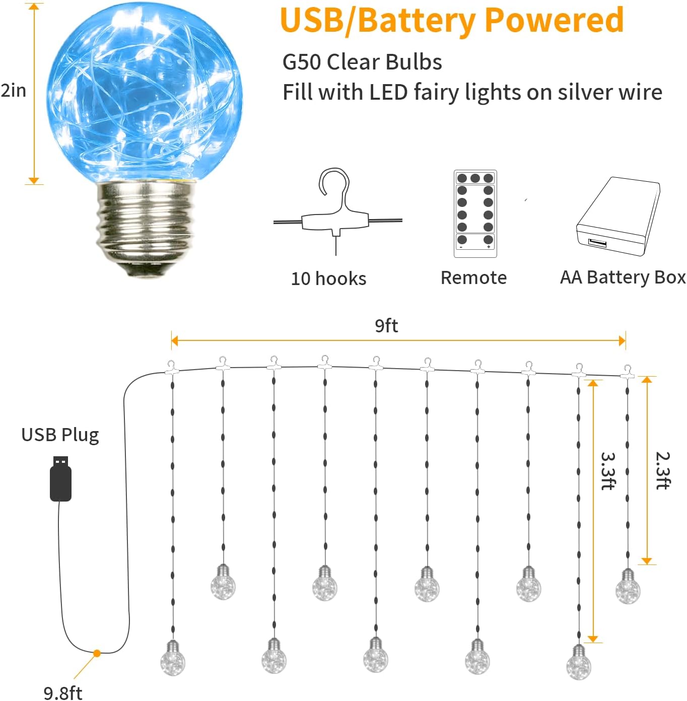 - Dual Power Options: The wishing ball lights feature 5V low voltage operation. It features a 9.8 ft USB plug cord to reach the USB device, and a AA battery box for battery power if there's no outlet nearby. It's easy and portable to illuminate the curtain lights. (AA batteries are not included)