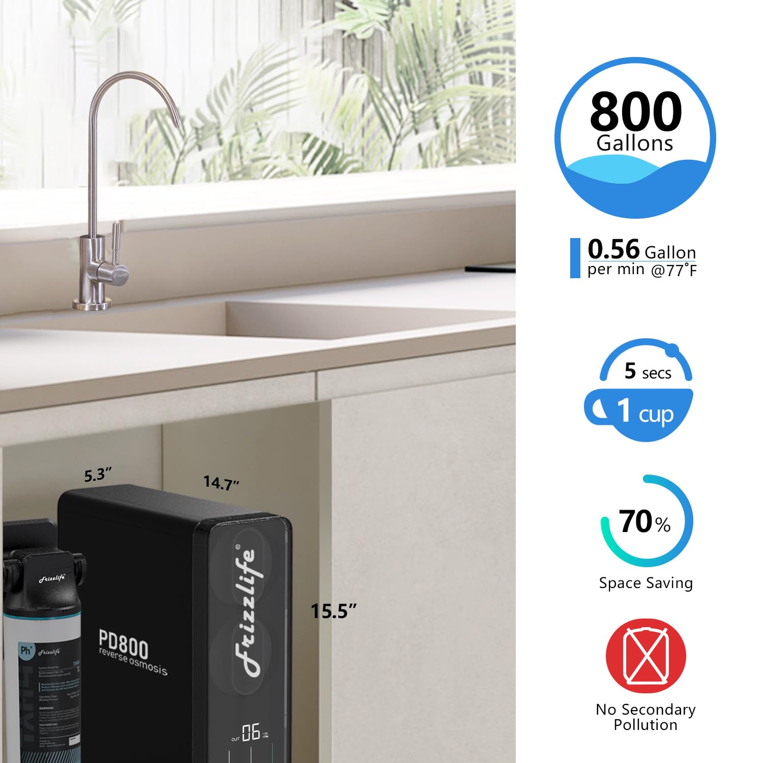 - ăTankless, No Secondary PollutionăFrizzlife PD800-TAM4 RO water filter system with Tankless design prevents potential secondary contaminants brought by the pressure tank. The built-in pump guarantees the RO water running out from the dedicated faucet is fresh and on demand! Meanwhile, it saves at least 70% under sink space. The integrated design comes with less connection point, the installation is DIY friendly and can be done in a few minutes with the straightforward guide video.