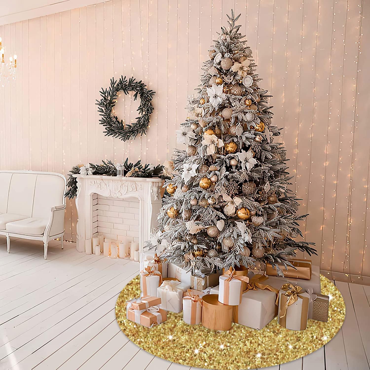 - âď¸ăSize Detail - Sequin Tree SkirtăYou will receive a 46 inches diameter gold glitter sequins tree skirt, fits under 8 foot tall trees. You can put some gifts, Christmas boxes, Christmas ball on the xmas tree cover mat. The sparkle velour Christmas tree skirts is perfect for decorating your home and become part of your holiday tradition.