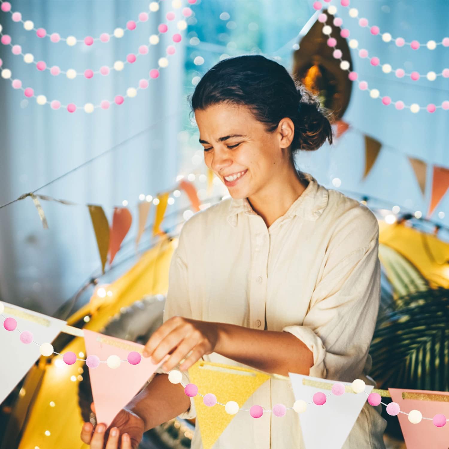 - OCCASIONS: Vintage modern style cute kawaii lovely special design, adding a warm rustic feel. It's easy to hang and can be hung anywhere, perfect funky eclectic decor for home, office, kids playroom, students classroom. The Pink Pom Pom Garland is a great Christmas decorations for indoor home, outdoor yard garden, living room, bedroom, stair railing, fireplace, ceiling, wall, door, window, gift basket, tree, mantle.
