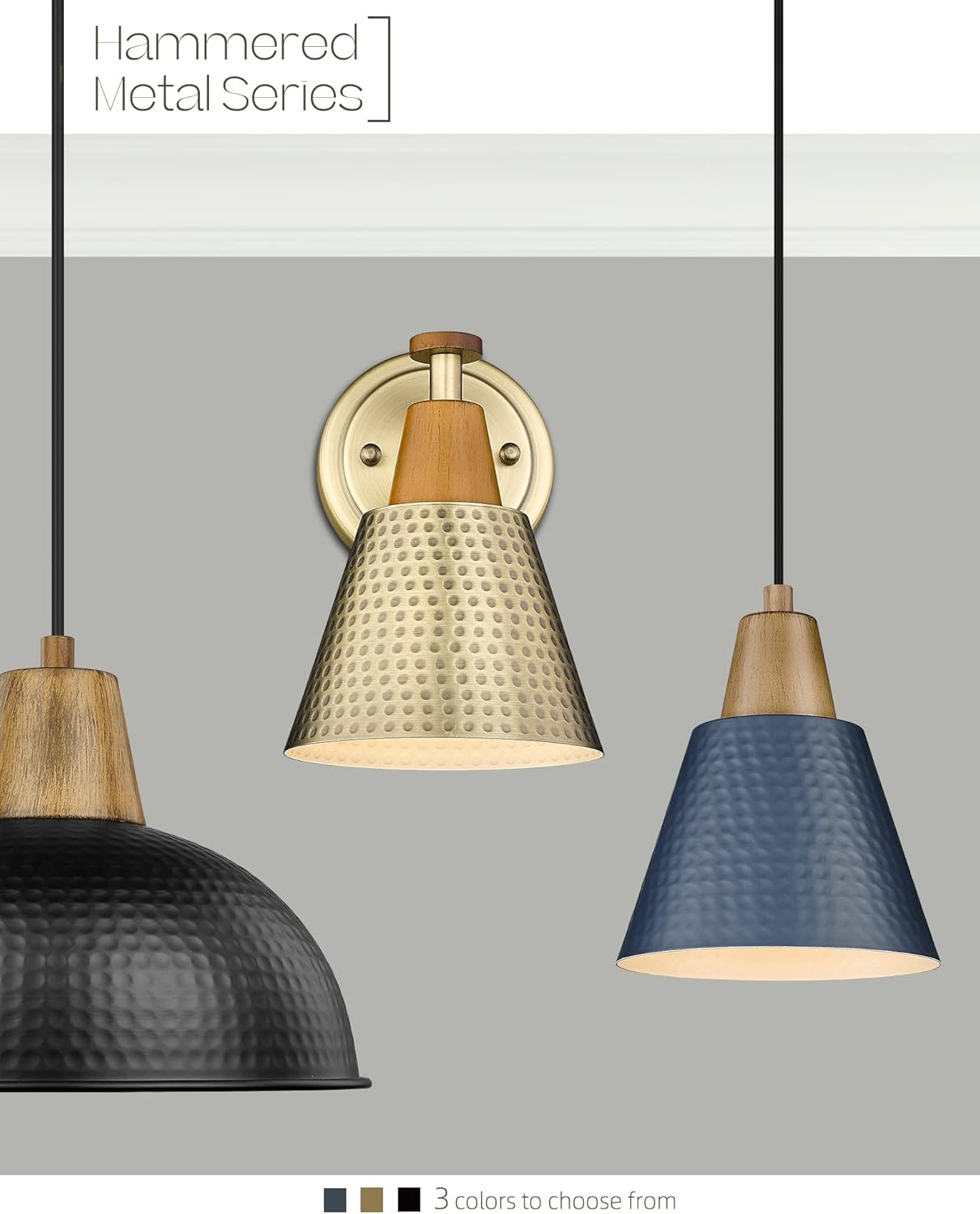 - 【Modern & Industrial Design】The antique brass wall sconces creates a sleek and minimalist look. Unlike other traditional design,this bathroom sconce wall lighting has hammered metal shade and wood grain paint finish on the top,making itself modern yet tasteful!