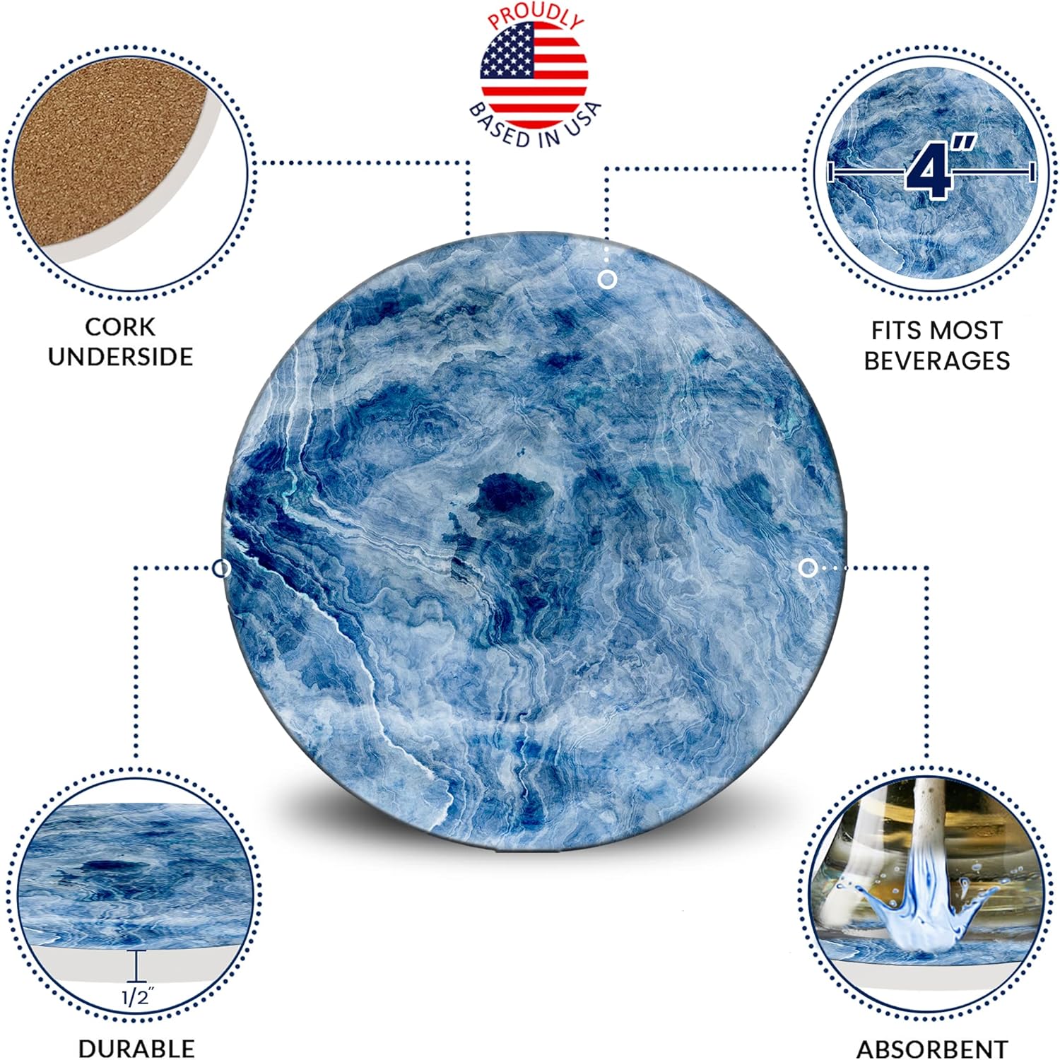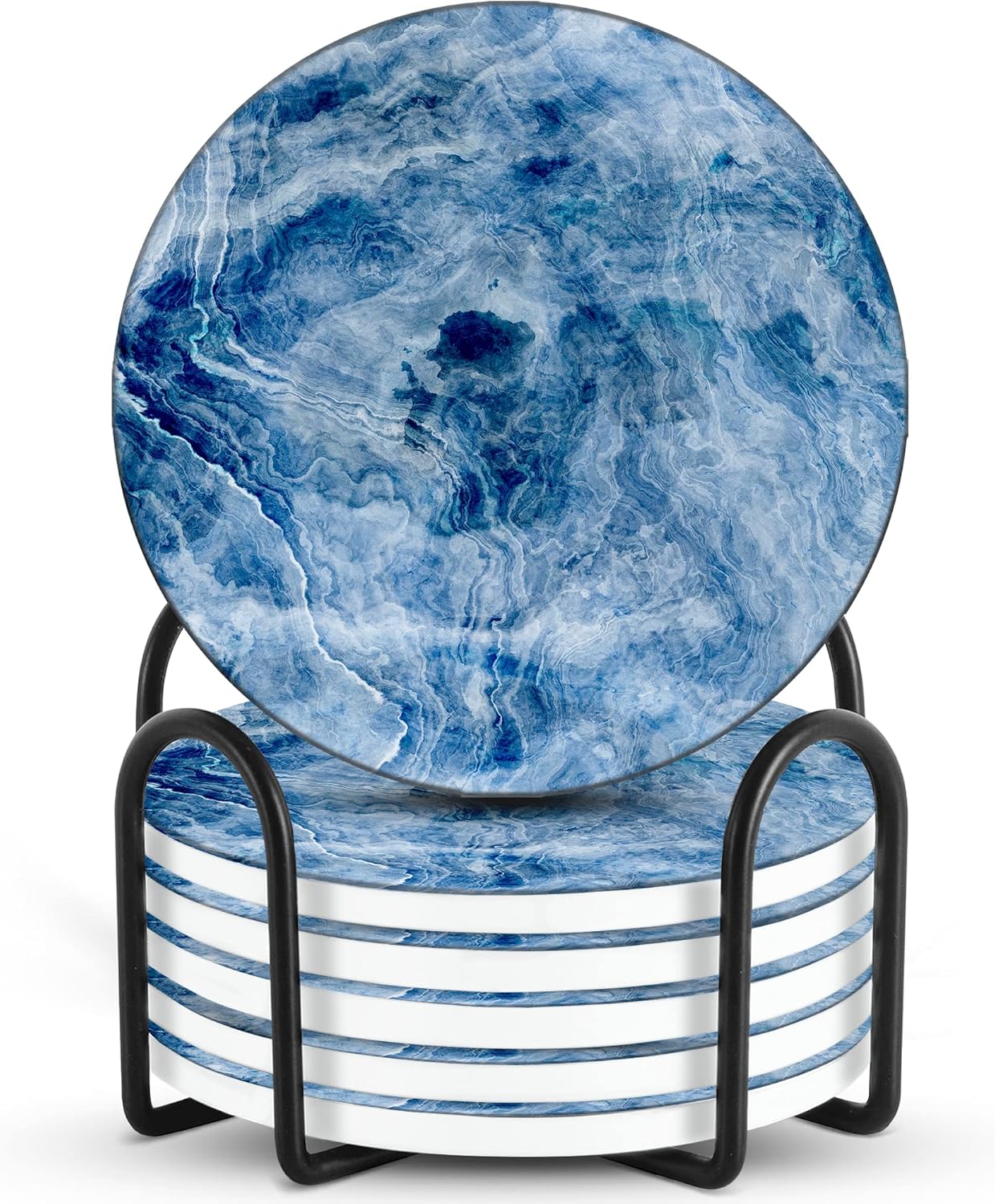Emerson Coasters for Drinks Absorbent – Natural Stone Drink Coasters Set with Holder, Coasters for Coffee Table, Wooden Tabletop Protection Marble Style – 100% Heavy Duty Set of 6 (Glacier)