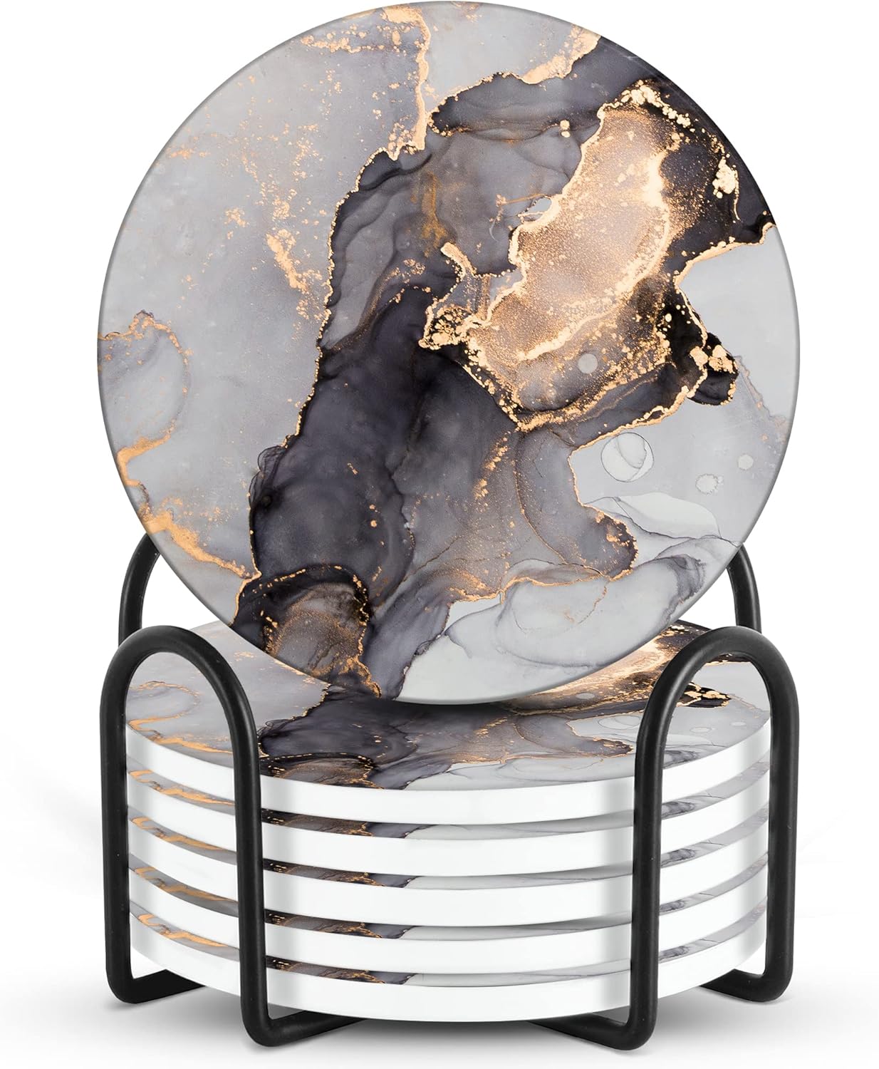 Emerson Coasters for Drinks Absorbent – Saucers Coffee Table Set of 6 with Holder, 100% Ceramic Wooden Tabletop Protection Marble Style, Non-Slip & Cork Bottom - Heavy Duty Drink Coasters (Crown)
