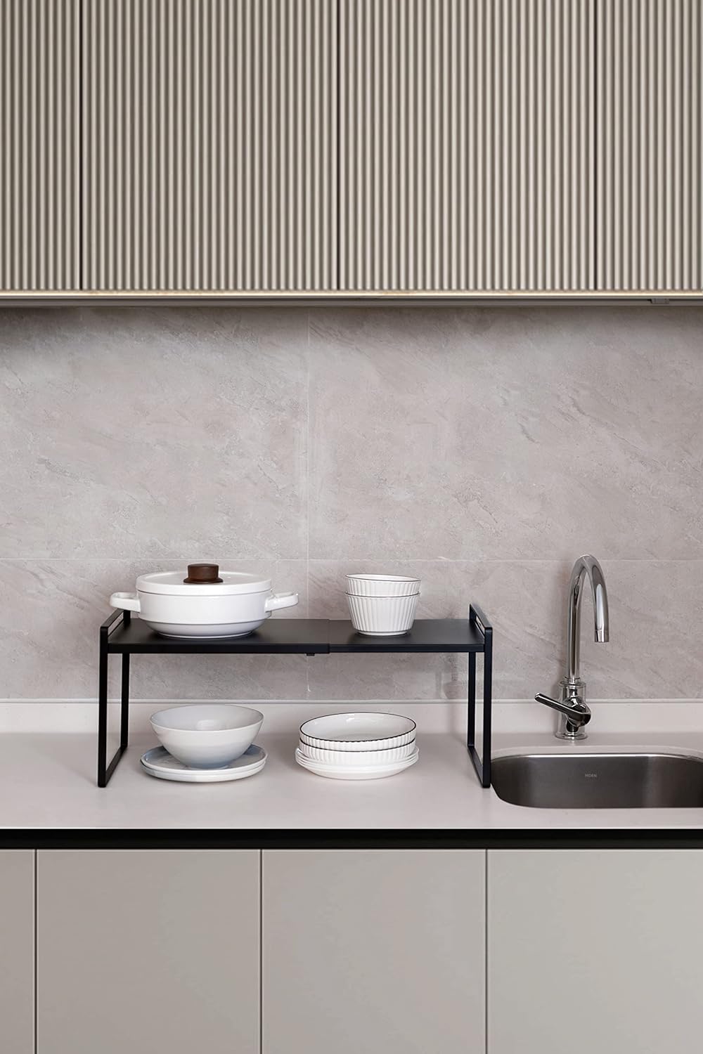 Nxconsu Expandable Cabinet Shelf Organizer Riser for Kitchen Pantry Cupboard Under Sink Countertop Home Storage Organization Rack Space Saver Freestanding Heavy Duty Nonslip Stackable Black